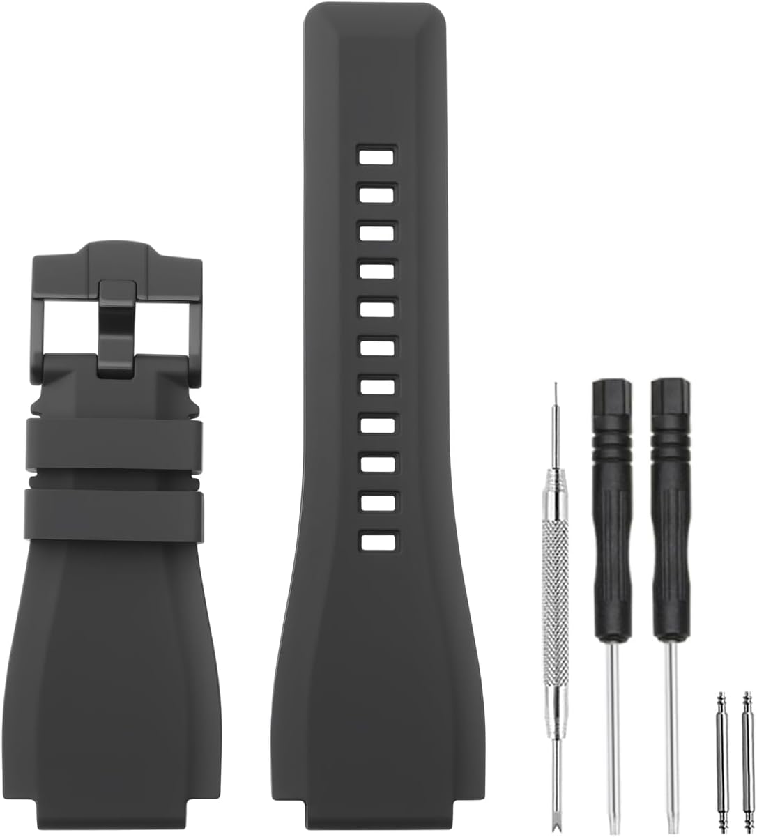 This special watch band is made of high-performance silicone rubber. It soft and flexible, lightweight and breathable, yet very sturdy, high end refined stainless steel buckle completes the design, makes you more beautiful when you wear, it is a perfect combination of stylish, function and fit. It has the characteristics of easy dry, sweat and water resistant, and durable, quality and reliable. the makes it a comfortable replacement strap that can be worn in all seasons, perfect for sports and daily use.Specifications:Band interface width: 24mm, Buckle width: 24mm.Color Option: Black, Blue.Buckle Option: Sliver Stainless Steel, Black Stainless Steel.Package List: 1 Watch Band, 1 Spring Bar Tool, 2 Spring Bar, 2 Remover Screws Tool. Compatible with Watch Model:It is suitable for Bell & Ross watch series BR01 and BR03, 24mm particular interface. Not for other watches.Special tips:In order to save your time and effort, Before you order, you need to know the correct model and band width for your watch. It is very important to comfirm that your watch strap size matches exactly. If you are not sure, please feel free to contact us.At HANYTON Watch Bands, we provides unique, high quality watch accessory replacement, we are very careful with every detail. We care about our products and care about our customers! For your any question in the bands, please contact us just like a friend, for sure we would solve problem for you in shortest time.