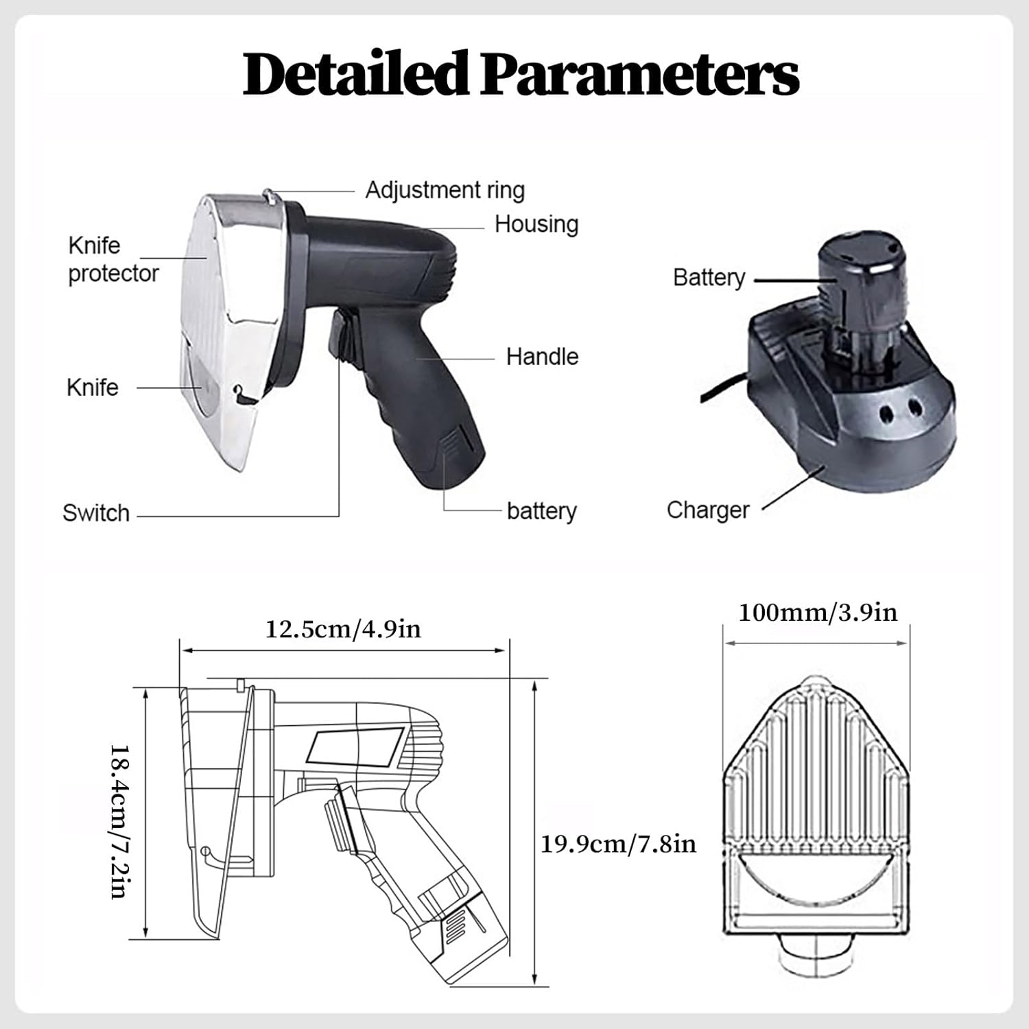 ※Product Features:1.Quickly slices meat to uniform thickness in seconds.2.Features a stainless steel blade guard.3.Safe, hygienic, and easy to clean.4.Adjustable meat slice thickness for convenient use.5.Easy-to-trigger switch for simple operation.※Product Parameters:Name: Rechargeable Meat SlicerPower: 80WSlicing Thickness: 0-8mmBlade Diameter: 100mmSlicing Efficiency: 60kg/hBattery Capacity: 12V 2.0Ah*2PCSBody dimensions: 125*199*184mm / 4.9*7.8*7.2inDimensions: 205*195*165mm/8.1*7.7*6.5inNet Weight/Gross Weight: 1.5/1.85kg※Package List:1*Commercial Electric Doner Kebab Slicer
