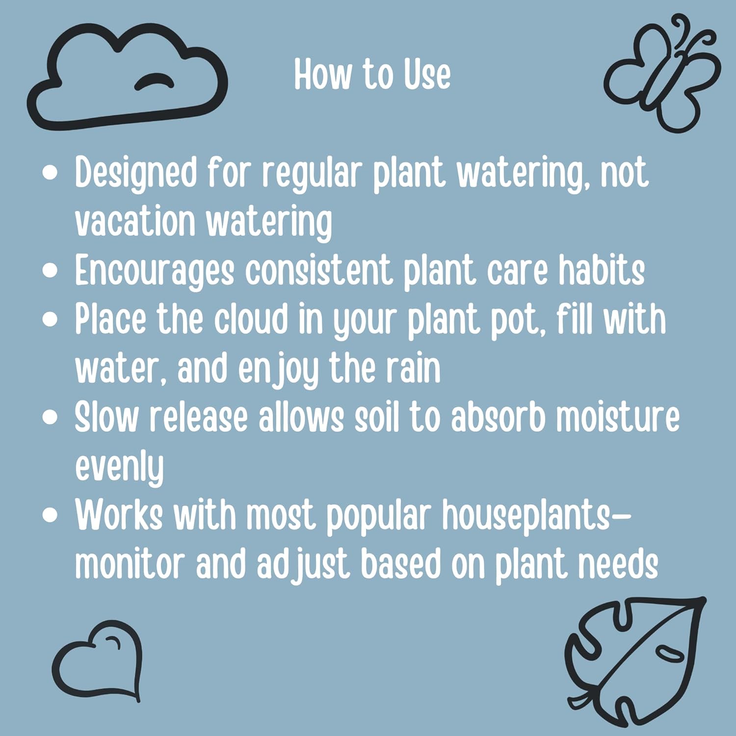 Turn ordinary plant watering into a relaxing rainfall experience with the Original Dripping Rain Cloud Plant Waterer. Handcrafted in North Georgia, this decorative indoor plant watering device creates a gentle, slow-release rain shower that mimics natural rainfall. Unlike traditional watering cans that pour too quickly, the rain cloud allows water to absorb gradually into the soil—supporting healthier houseplants and reducing runoff. Perfect for plant lovers who value both function and aesthetic, this unique houseplant accessory adds charm and whimsy to any indoor plant display. HOW IT WORKS Simply insert the clear acrylic rods into your plant pot (5 inches or larger), fill the cloud reservoir with up to 4 ounces of water, and enjoy a 5-minute rain shower that hydrates your plant evenly. DESIGNED FOR ROUTINE WATERING This plant watering tool is intended to enhance regular watering schedules, not for extended or self-watering irrigation. CARE INSTRUCTIONS Clean with mild soap and warm water as needed. The Original Dripping Rain Cloud — where plant care meets art.