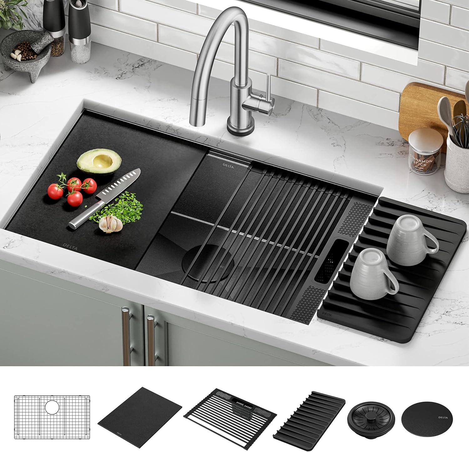 The DELTA Rivet Workstation Collection is defined by clean lines and tightly rounded corners, offering a streamlined contemporary look that enhances any kitchen style. These sinks are designed with a built-in WorkFlow ledge that helps make food prep easy by allowing you to slide accessories across the sink, creating a multifunctional work surface for seamless transition between tasks. The kit includes a durable cutting board and roll-up dish rack with removable utensil holder that allow you to combine prepping and cleaning in one convenient location. Heavy-duty TRU16 gauge construction offers long-lasting durability so that you can use your sink with confidence. Engineered with a heavy-duty 4mm mounting deck, the drop-in sink design is easy to install with any kitchen countertop. The deep single bowl offers enough room to wash large items while containing mess and splatter inside the sink. Multi-layer NoiseDefend soundproofing reduces noise and vibration from dishes, running water, and garbage disposal. SatinSheen finish provides a smooth surface that’s easy to clean, so your sink stays beautiful with less effort. Channel grooves and a sloped bottom improve drainage, while EZClean corners reduce build-up over time. The installation-ready sink includes all mounting hardware and a stainless steel drain assembly to get your installation moving fast. You can feel comfortable in your kitchen knowing that DELTA sinks are backed by a Lifetime Limited Warranty