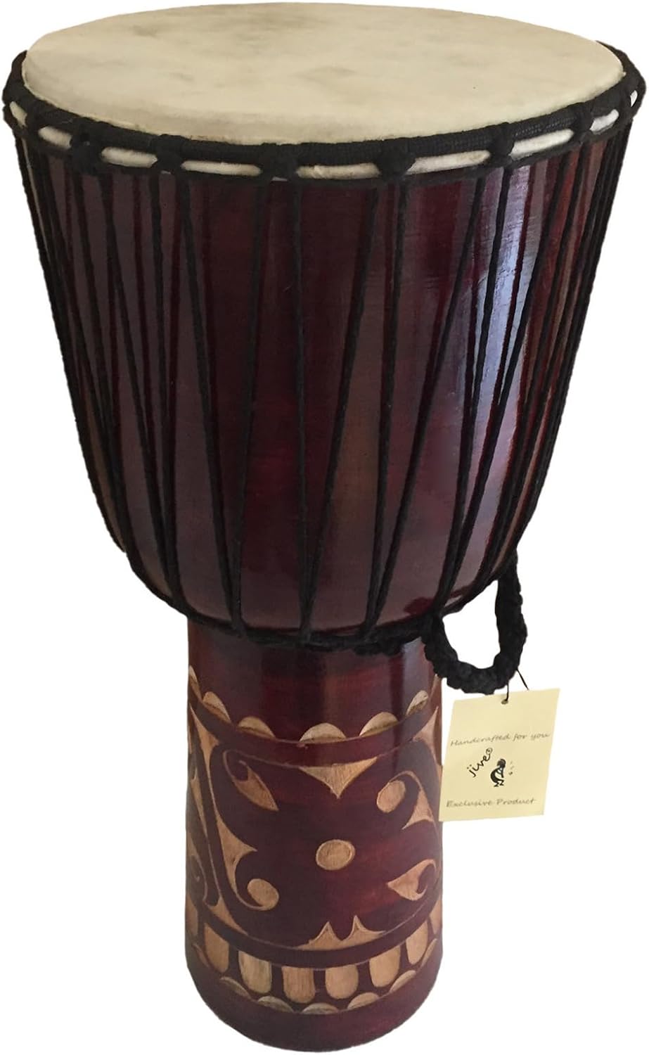 Experience the authentic sound and spirit of Africa with the JIVE Djembe Drum. Each drum is individually hand carved from solid mahogany and hand painted with traditional tribal designs, making it not only a powerful musical instrument but also a one-of-a-kind work of art. No two drums are alike – every piece carries its own unique character, with hand-painted motifs and natural wood variations that ensure you own a truly original instrument. Tribal patterns will vary, giving each drum its own personality and story. The goatskin drumhead produces a rich, resonant sound with deep bass and crisp slap tones. Rope tuning and heavy-duty cords provide stability, allowing the djembe to deliver authentic tone whether you’re performing on stage, playing in drum circles, or using it for music therapy and classroom learning. Standing 12" high, this medium-sized djembe offers the perfect balance between portability and projection. It’s easy to carry, yet powerful enough to be heard in group settings. Ideal for beginners, students, and experienced percussionists alike. JIVE is a trusted fair-trade brand, supporting artisan communities and preserving traditional craftsmanship. Unlike mass-produced drums, each JIVE djembe is made with care, cultural authenticity, and premium mahogany wood. Ships fast from the USA, ready to inspire your rhythm journey.