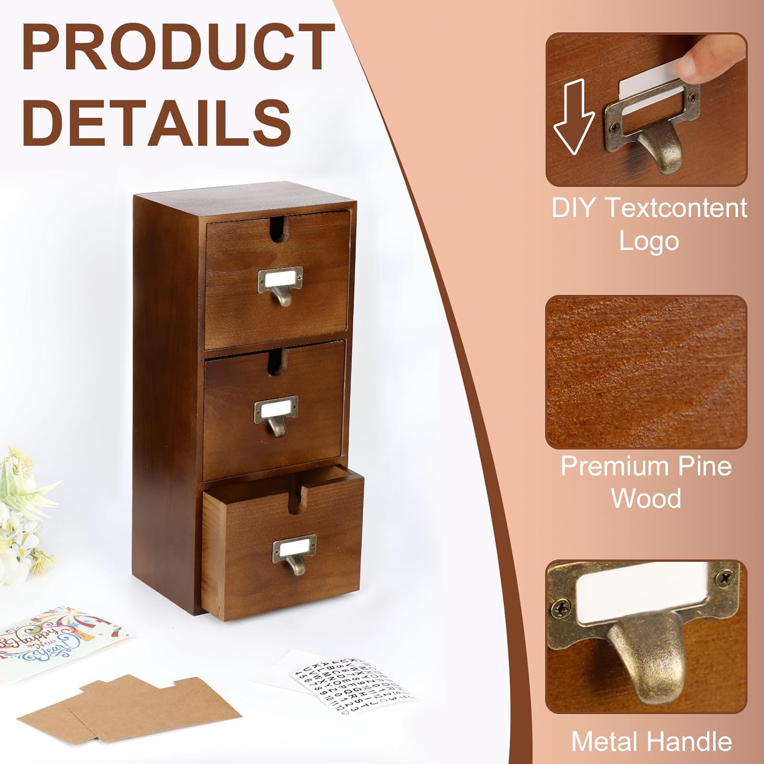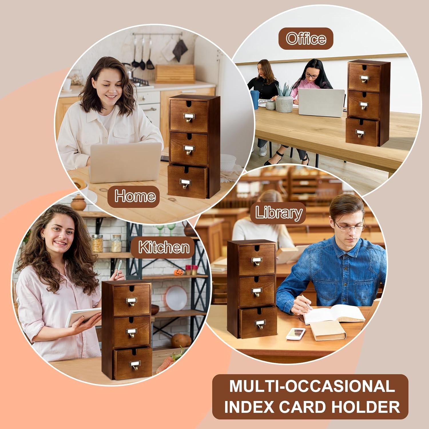 3 Tier Index Card Holder 3x5 Wooden Card Catalog Box with 3 Drawers Brown Index Card Storage Box Flash Card Holder Index Card Organizer 25 Index Card Dividers 2 Letter Smile Stickers for Office Package:1 Three layer Index Card Holder,25 PCS index card dividers,2 Letter Smile Stickers Material:Pine Wood Size:Wooden Index Card Box 6.5x6.1x15 inch, 5x3 inch index card dividers ,3.7x3 inch Letter Smiling Stickers Application:School Office