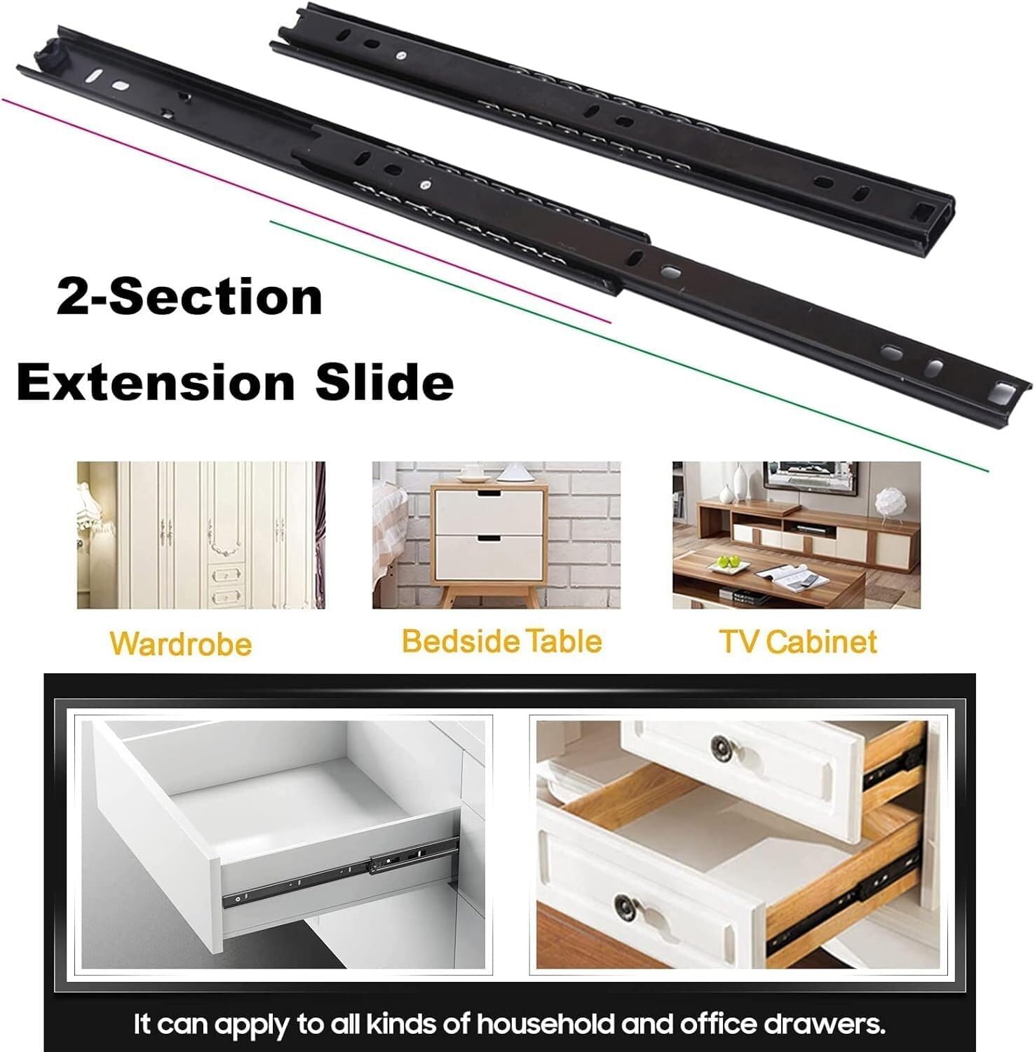 Drawer Slides, 2 Section Telescopic Ball Bearing Side Mount Slides, Drawer Slides, for Cabinets, Home Furniture. Features Metal sliders. Cold rolled steel plates, sturdy and durable. 2-fold slides Partial Extension Detachable and easy to install. Solid ball bearing. Provides smooth, friction-free movement when opening the drawer. Rubber pads, rubber stoppers prevent automatic opening. Anti-rust and wear-resistant: there is a black electrophoretic layer on the surface, which can prevent oxidation and wear, and can be used for a long time. Product Name: Slides > Material: Cold Rolled Steel > Thickness: 10 mm > Width: 27mm > Surface treatment: anti-rust coating (wear-resistant, rust-resistant, anti-corrosion) > Mounting Methods: Side Mount > The package contains. Drawer Slides (x 4) + Mounting Screws > Suitable for: kitchen cabinets, cupboards, cabinets, drawers, desks, bedside tables. Heavy Duty Drawer Runners, Ball Bearing Runners, Side Mount, Black, Metal Rails, Telescopic Sliding Rail, Drawer Guides, Kitchen Cabinet Drawer Guides, Keyboard Tray Guides, Table Extension Guides
