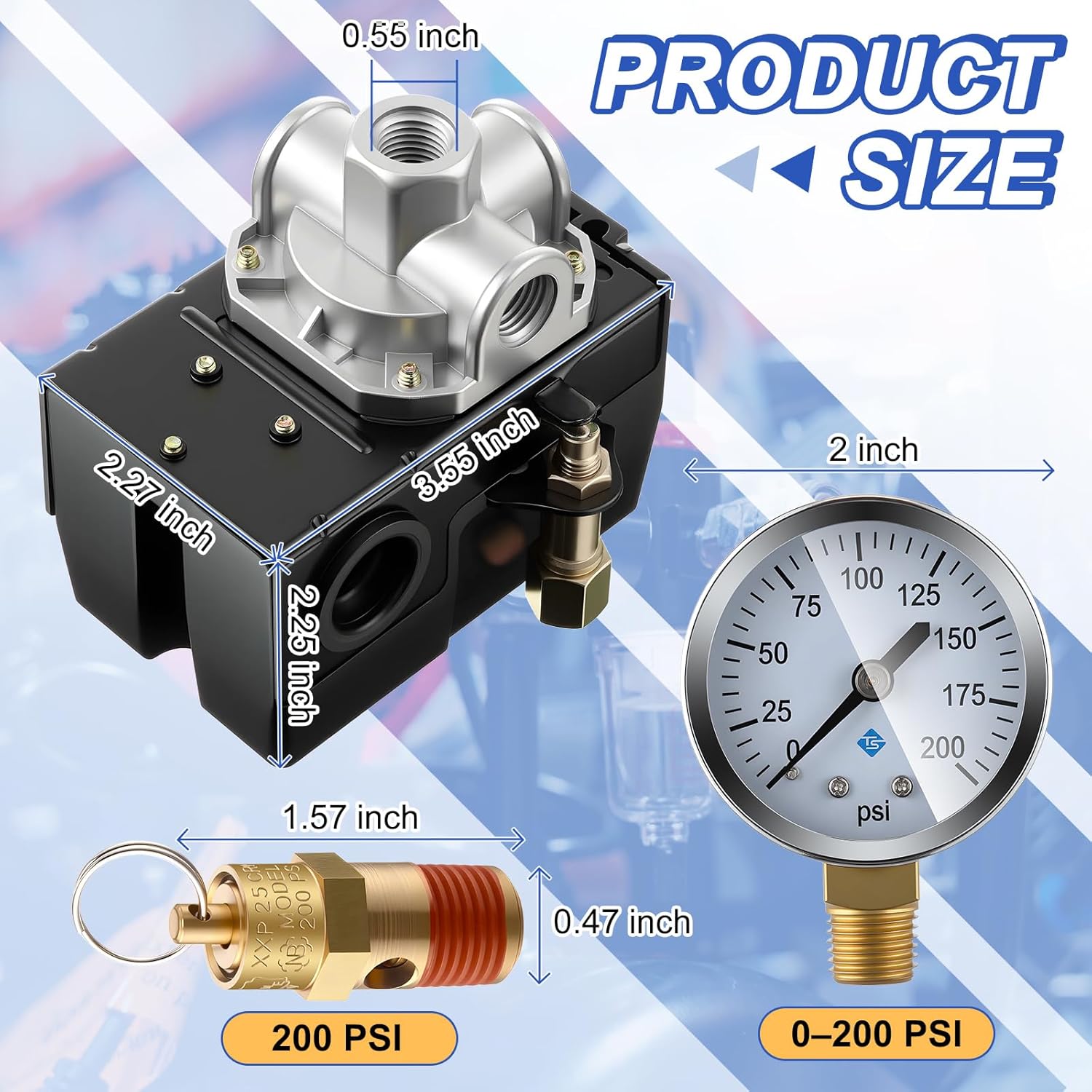 | Included Components | 1 x Pressure gauge, 1 x Pressure switch, 1 x Safety valve |