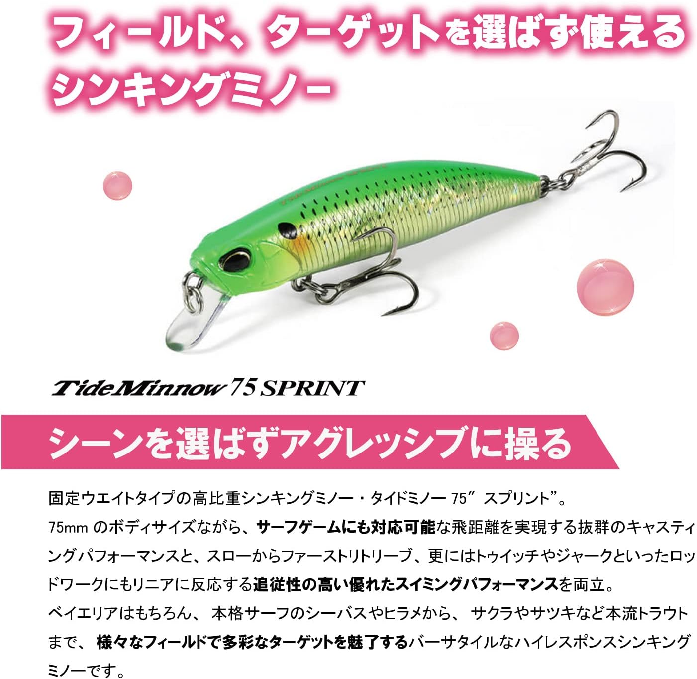 Duo Tie Dominoes 75 Sprint! Sinking Minnow can be used regardless of the field or target. Sinking Minnow 75 Tidy Dominoes Sprint is great for all kinds of fields, including Bay Areas, Surfs, Rivers and Fields. It has a quick swimming, good water tangle, and range control performance that can be used to attract a variety of targets with variable retrieve speed and rod work as well as irregular action with natural fall.