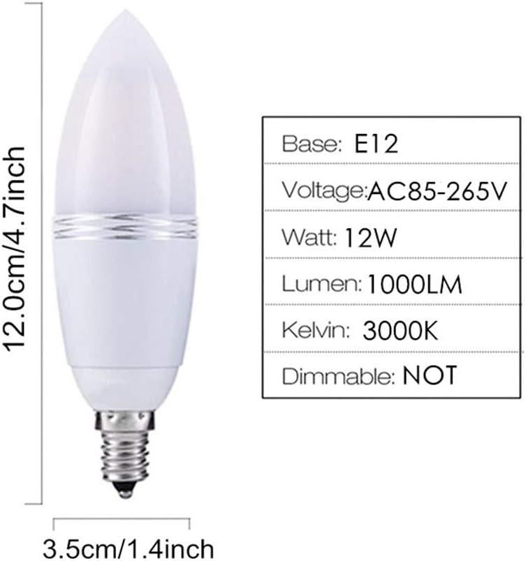 ✔Not Dimmable ✔Shell Material: Aluminum ,PC Lampshade ✔Base Type: E12 ✔Size: 12.0*3.5 cm/1.4*4.7 inch ✔Light Color: Warm White,2800-3200K ✔LED Quantity:60 pcs 2835 SMD ✔Input: AC 85-265 V ✔Power: 12W(replace 80W-100W halogen bulb) ✔Package Included: 4*E12 Candelabra LED Bulbs Beautiful appearance, perfect for decoration.12 watts LED candelabra light LED corn light bulbs. E12 100W incandescent replacement. Save power more than 88% by ordinary bulbs. Easy Installation: Installs into existing standard American candelabra base led bulb E12 fixtures directly. No mercury. Low maintenance cost. Long time working, Long life time,up to 30,000 hours. Perfect for home indoor lighting, hotel, meeting room, offices, hospital, schools, factories, museum, shopping malls, supermarkets, restaurants or any other places where accent lighting is required.