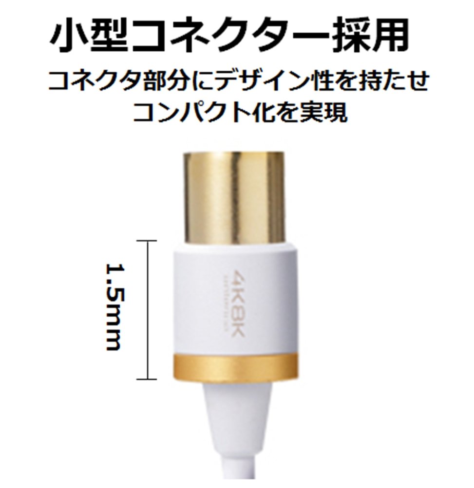■ Antenna cable for connecting TV to terrestrial broadcasts, 4K8K broadcasts, and recording. ■ It has a triple-shielded structure that is strong against the reception of 4K8K broadcast (frequency range ~ 3224MHz). ■ Uses Teflon wire material that reduces noise and is resistant to terrestrial digital broadcasting and BS/CS broadcasts. ■ The connector part has a design that makes it more compact. ■ On one side of the connector is a small L-shaped connector that can be installed along the wall of the room. ■ Uses a soft slim cable with a diameter of 0.14 inches (3.6 mm) that is easy to wire and is hard to
