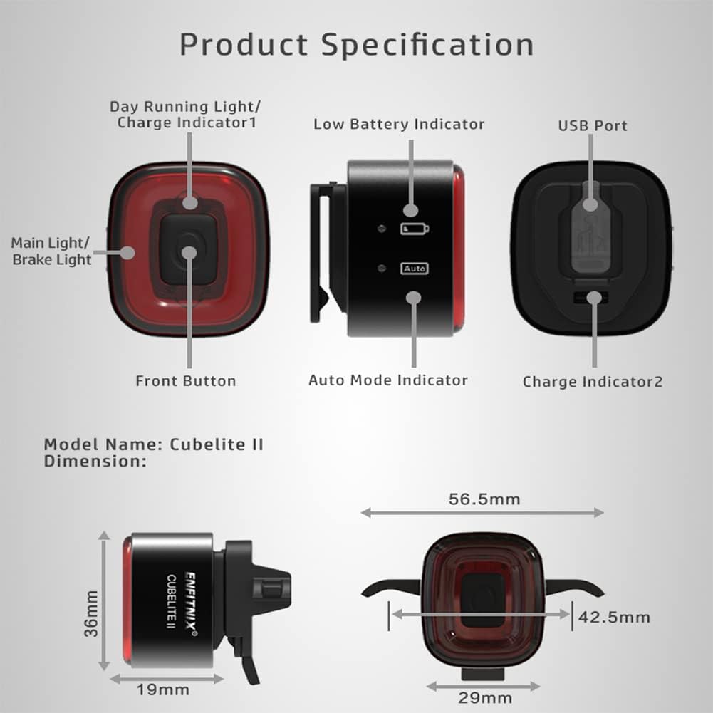 Cubelite II * Integrated 32-bit-ARM Coretex MO Processor and 6-axis Motion Sensor * 22% Smaller Than Xlite100 * High-strength Aluminum Alloy Casing / CNC Processing /Laser Engraving Logo * IPX5 Waterproof * 400mAH Lithium Battery * DC5V 300mA Input * Color: Black * Lighting Mode: Flash / Breath / Constant * Running Time: Flash: More than 30 hours Breathing: More than 15 hours Constant: More than 10 hours * Two Way Mounted: Seatpost or Saddle * Package List 1pc Light Body 1pc Saddle Mount 1pc Seatpost Mount 1pc Instruction Manual 4pcs Nylon Belt