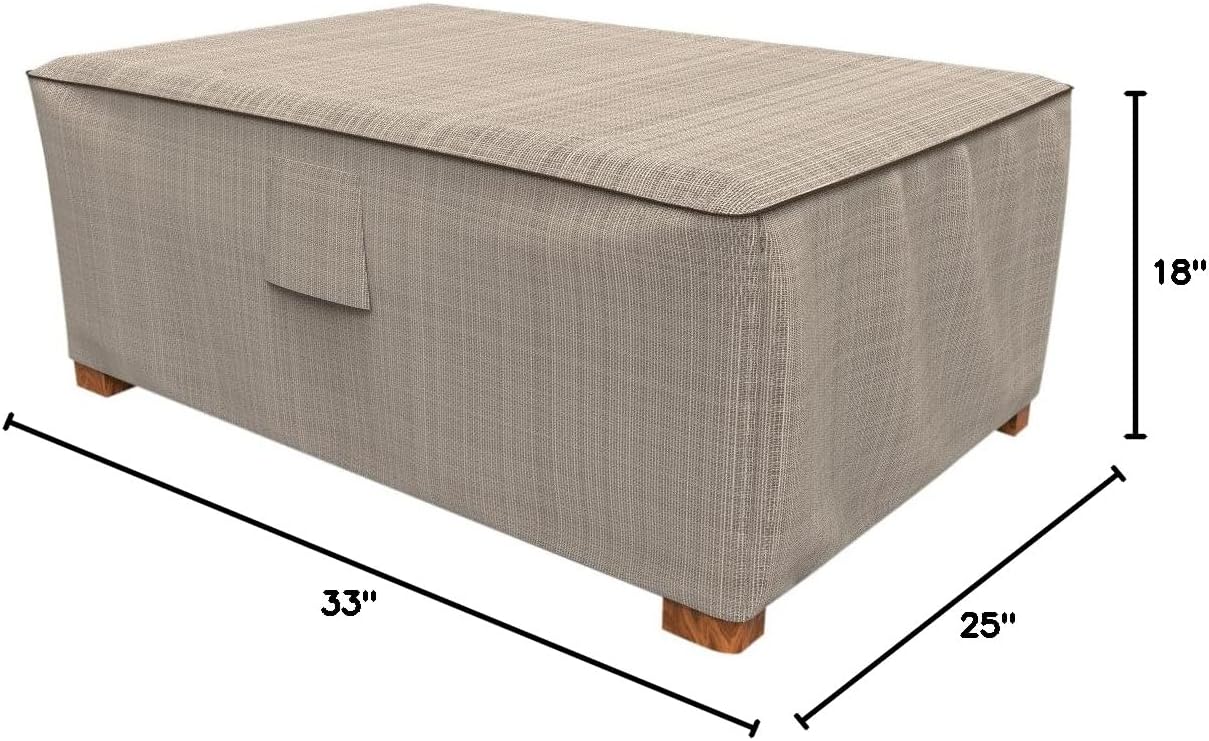 The Budge English Garden Patio Ottoman Cover/ Coffee Table Cover provides high quality protection to your patio ottoman or coffee table. Peaceful tranquility meets heavy-duty protection with Budge’s English Garden collection. This collection features a woven tan pattern that is accentuated by dark gray piping, which lines the outer seams of the outdoor ottoman covers. Impeccably stylish, the English Garden collection will compliment any outdoor garden or patio setting, all while keeping your furniture protected, rain or shine. Made from heavy-duty machine-woven 600 denier polyester is 100% waterproof & provides protection against fading, rain, sun, dust, bird droppings, tree sap & more. Strap & buckle systems are included to help better secure the cover to your furniture in windy conditions. Ultrasonically-welded seams enhance both the protective properties & longevity of the covers. Sewn-in vents are strategically placed throughout the covers to ensure adequate air flow and reduce condensation.