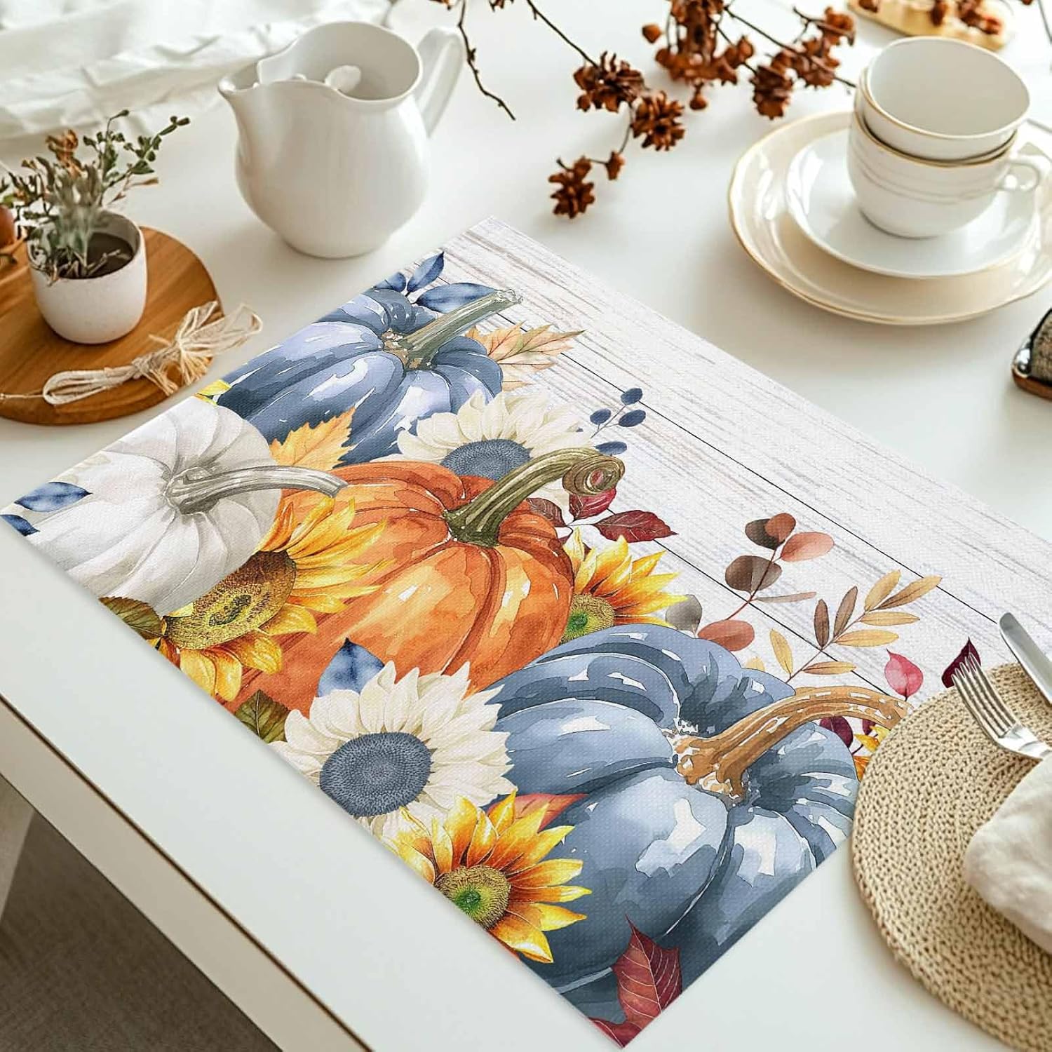➤Add a sense of luxury to the table ➤High-tech printing process to make the picture colorful and clear. Not easy to fade and can be used with confidence. ➤Personalized custom graphic design highlights your personal characteristics, improves your dining experience and impresses guests. Fall Pumpkin Placemats Function: Placemats Size:13""x19""(33cmx48cm), Material: 70% polyester and 30% cotton The effective insulation of these table placemats could reach to 176°F(80℃), can protect your dining table well. The anti-slip feature can also effectively protect you and your family during meals. Multipurpose Use: This pumpkin placemats set is suitable for decorating the dining table in autumn. Also, it can be used as an indoor or outdoor party decoration that welcomes fall. Add a touch of fun to your holiday table decorations. About cleaning: Cleaned with water and dry under the shade. Natural drying is recommended. When you counter crease problems, flatten the table mat and put some heavy objects on it, then the Crease will disappear.