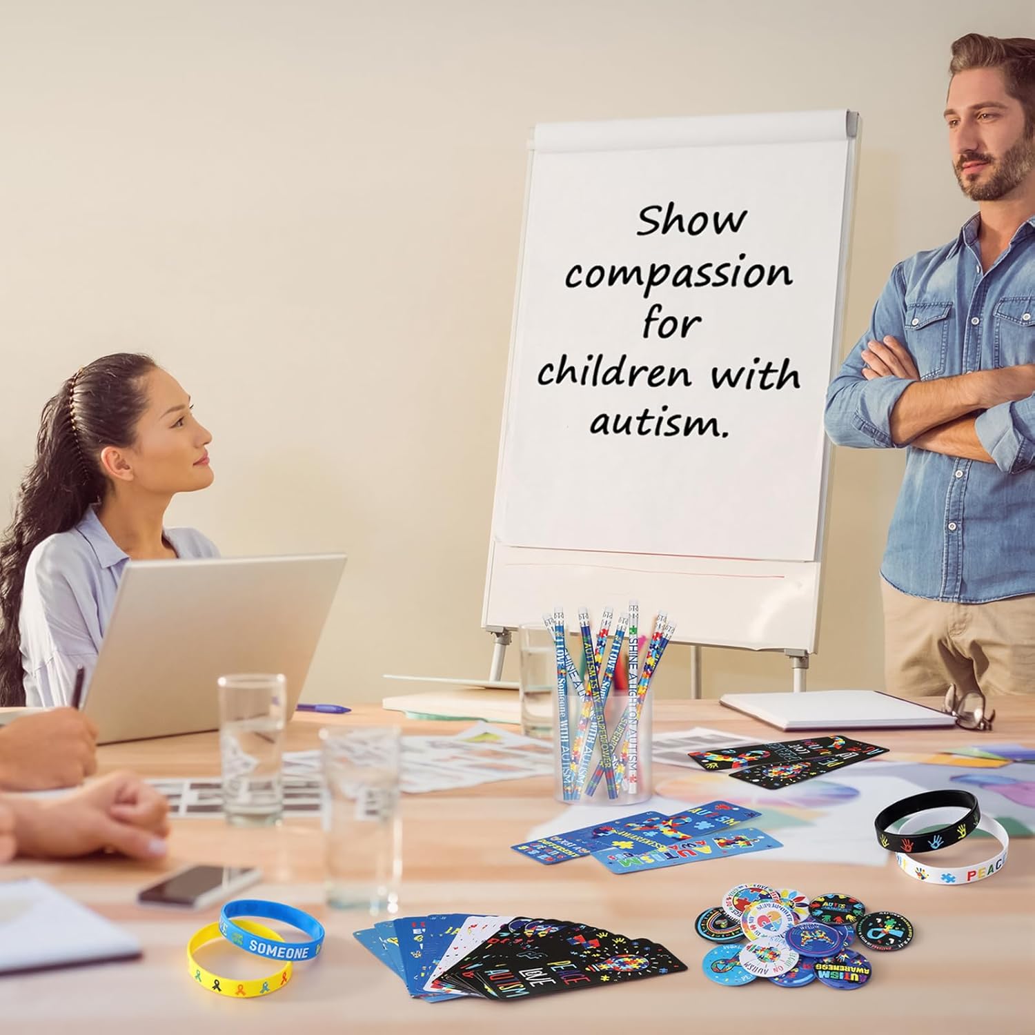 Features: Our wristbands are meticulously crafted from silicone that ensures durability and comfortable wear. The keychain, on the other hand, is made from acrylic, making it lightweight yet sturdy, ensuring it can withstand frequent use without wearing out. Our colorful autism awareness week items makes it a standout accessory. Being glaringly noticeable, this vibrant hue is a bold statement of support for the cause it represents, ensuring the message it stands for cannot be overlooked. Specifications: Material: Wristbands: silicone Keychain: acrylic Color: colorful Size: Notebook: 3.15 x 4.92 inches Bookmarks: 5.59 x 2.05 inches Pin: 1.5 inches Stickers: 1.5 inches Package includes: 24 x Autism awareness pin 24 x Notebook and 24 bookmarks with ribbon 24 x Keychain 24 x Silicone wristbands 1 Set of stickers Notes: Manual measurement, please allow slight errors on size. The color may exist a slight difference due to different screen displays.