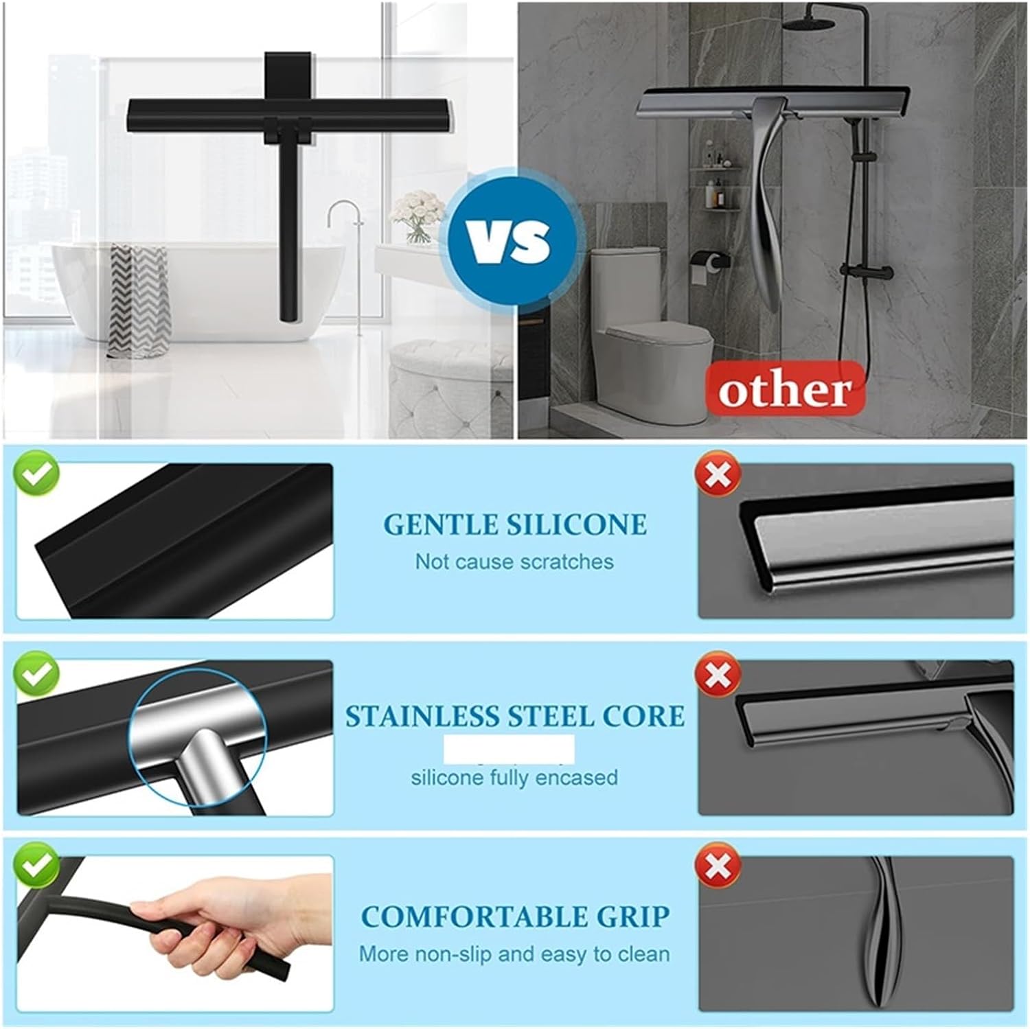 Introducing our Premium Glass Silicone Wiper Shower Screen Squeegee, expertly designed to keep your shower doors and windows spotless. With a silicone wiper and a robust stainless steel core, this squeegee ensures a streak-free finish every time you use it. Available in two sizes, 21CM and 28CM, it caters to various shower door and window dimensions. The included silicone hook allows for easy storage, making it a addition to your bathroom cleaning tools. Its sleek design not only enhances functionality but also adds a touch of modern to your bathroom decor. Say goodbye to water spots and hello to a sparkling clean space!
