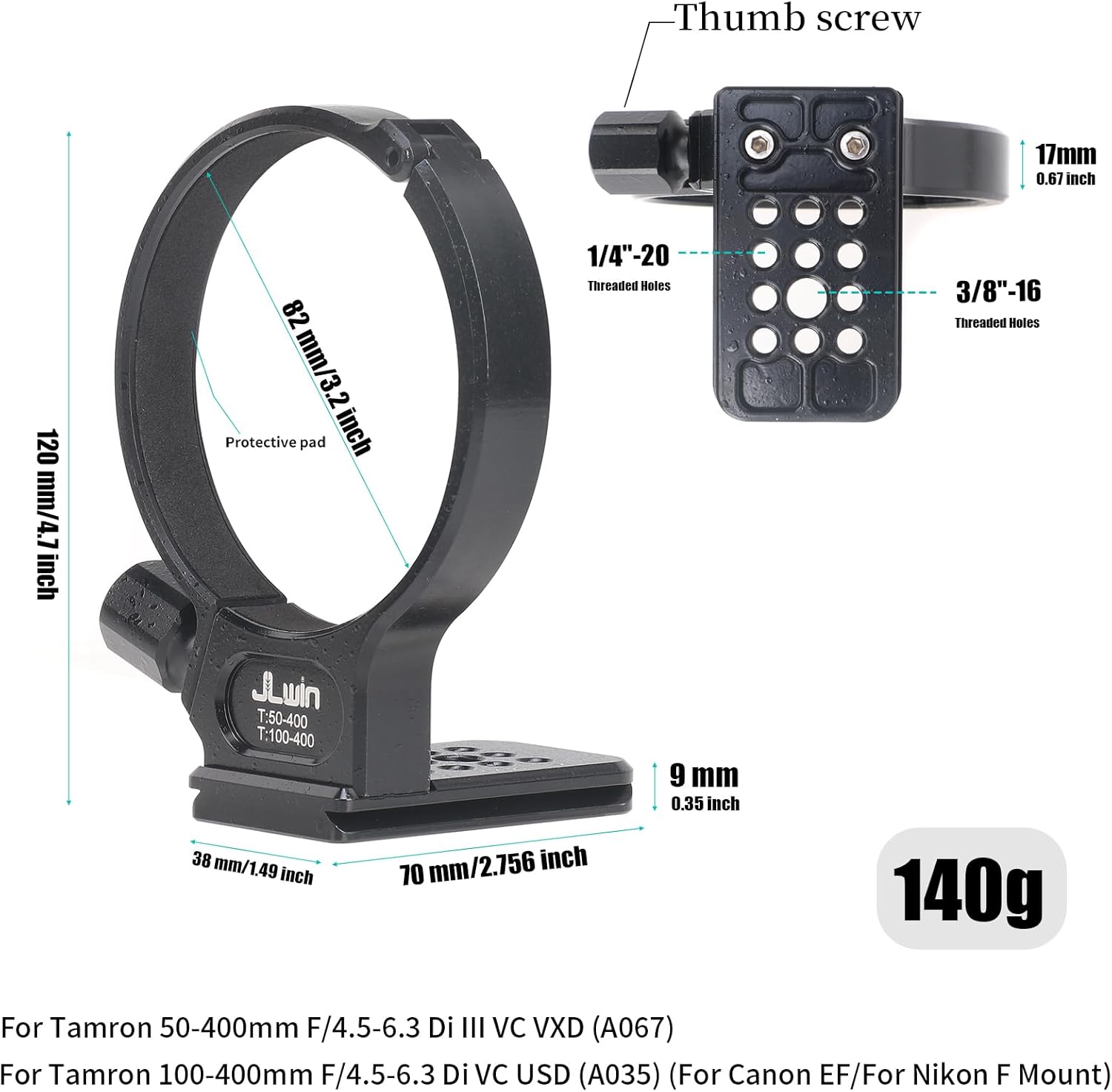 Introduction:Brand New! High Quality!! Description:The tripod mount ring mount on the tripod, it helps you fix and balance your tele lens which is heavy or long lens hanging off the front of camera.It features Arca-compatible dovetail plate which allow you attach your lens to Ball Head, Clamp or Panorama Head of Arca-Swiss standard. Reserved multiple 1/4"-20 & 3/8"-16 thread screw holes at the bottom for attach lens to tripod directly. Made of aviation aluminum alloy and CNC precision machining, anodizing surface treatment, right weight and strong building.100% fits for Tamron and does have same construction. Specifications:Made by metal with very high qualityThe UNC (Unified National Coarse Thread) : 1/4" & 3/8" Compatibility: Arca-Swiss StandardRing inside diameter: 82mmBaseplate Length: 70mm Baseplate Width: 38mmColor: blackNet Weight: 140g Compatible with:For Tamron 50-400mm F/4.5-6.3 Di III VC VXD (A067) Lens For Tamron 100-400mm F/4.5-6.3 Di VC USD (A035) Lens (For Canon EF Mount, For Nikon F Mount) lens and other lenses Package Includes:1 x Lens Tripod Mount Ring