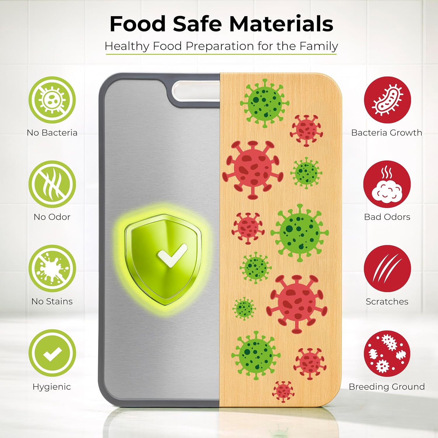 Upgrade your kitchen with this premium titanium cutting board, engineered for cleaner, safer, and more efficient food prep. Featuring a dual-sided design, it keeps raw meat separate from fruits, vegetables, and ready-to-eat foods to improve kitchen hygiene and reduce cross-contamination. The non-toxic, BPA-free, non-porous titanium surface resists stains, odors, bacteria, and deep cutting grooves—making it one of the most hygienic cutting boards available. Crafted from 100% pure titanium, this board offers exceptional durability while remaining knife-friendly, helping preserve the sharpness of your blades better than plastic, wood, bamboo, acacia, or glass cutting boards. Lightweight, stylish, and easy to handle, it is also dishwasher safe, making cleanup simple after meal prep. Perfect for modern kitchens, this high-performance, long-lasting cutting board delivers the ideal combination of strength, safety, and convenience for everyday cooking.