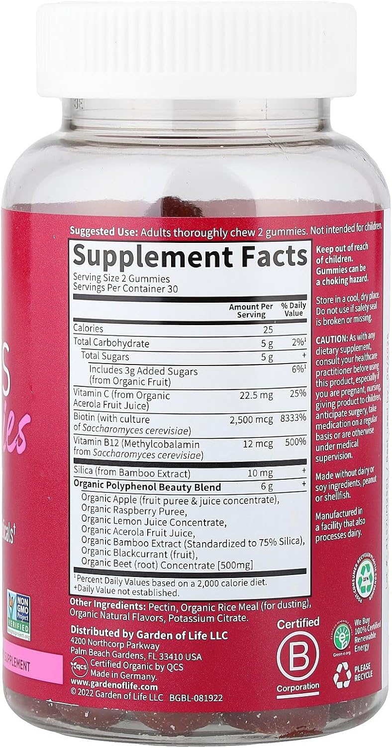 Designed for health-conscious adults seeking beauty support from within, Garden of Life BEETS Beauty Gummies delivers a comprehensive 6g organic polyphenol beauty blend per 2 gummies, including apple, raspberry, lemon, acerola blackcurrant, and beet root, plus beautifying vitamins including 2,500mcg biotin, 12mcg vitamin B12 as methylcobalamin, 10mg silica from organic bamboo extract, and 22.5mg vitamin C from organic acerola. This formula supports youthful skin, healthy hair, and strong nails.* Made with whole food ingredients including real fruit and beet root, sweetened with organic fruit—no cane sugar or glucose syrups—these beet gummies feature a delicious raspberry flavor. Garden of Life BEETS Beauty Gummies are made without synthetic binders or fillers and include no artificial dyes. Garden of Life BEETS Beauty Gummies are Third-Party Certified Non-GMO Project Verified, NSF Certified Gluten-Free, and Vegan. Adults take 2 delicious beet root gummies daily for convenient hair, skin, and nail support.* *These statements have not been evaluated by the Food and Drug Administration. This product is not intended to diagnose, treat, cure or prevent any disease.