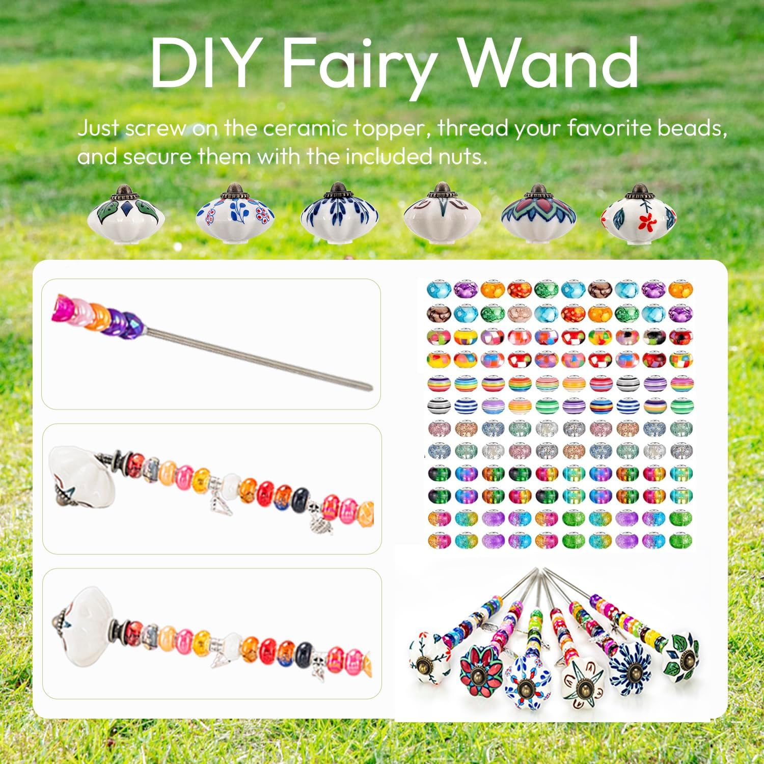 The fairy beads featured in this kit are vibrant and will stand out beautifully in any garden. The large hole beads for garden stakes are easily threaded onto the garden rods, perfect for creating your own fairy sticks or flower pot decorative stakes. They glimmer in the sunlight, adding a magical touch to your garden. These garden stakes decorations are not just for adults but can also serve as a fun activity for kids. The fairy wand garden stake beads kits are easy to assemble, making them an entertaining and educational DIY project. These beaded garden plant stake is a nice choice for indoor and outdoor decoration, it is also a suitable gift for Christmas, birthdays, Mother's Day, housewarmings, weddings and more. Specifications: Material: Threaded rod: 304 stainless steel Toppers: Ceramic Colored beads: Resin Small pendants: Metal Ceramic toppers color: 6 colors Size: Threaded rod: about 11.8 in / 30 cm, 4 mm in diameter Nuts: about 0.16 in / 4 mm in diameter Ceramic toppers: about 1.5 inches/ 40 mm Beads: about 0.19 in / 5 mm in hole diameter Package includes: 6 x Threaded rod 6 x Nuts 6 x Ceramic toppers 12 x Small pendant charms 100 x Round colored beads