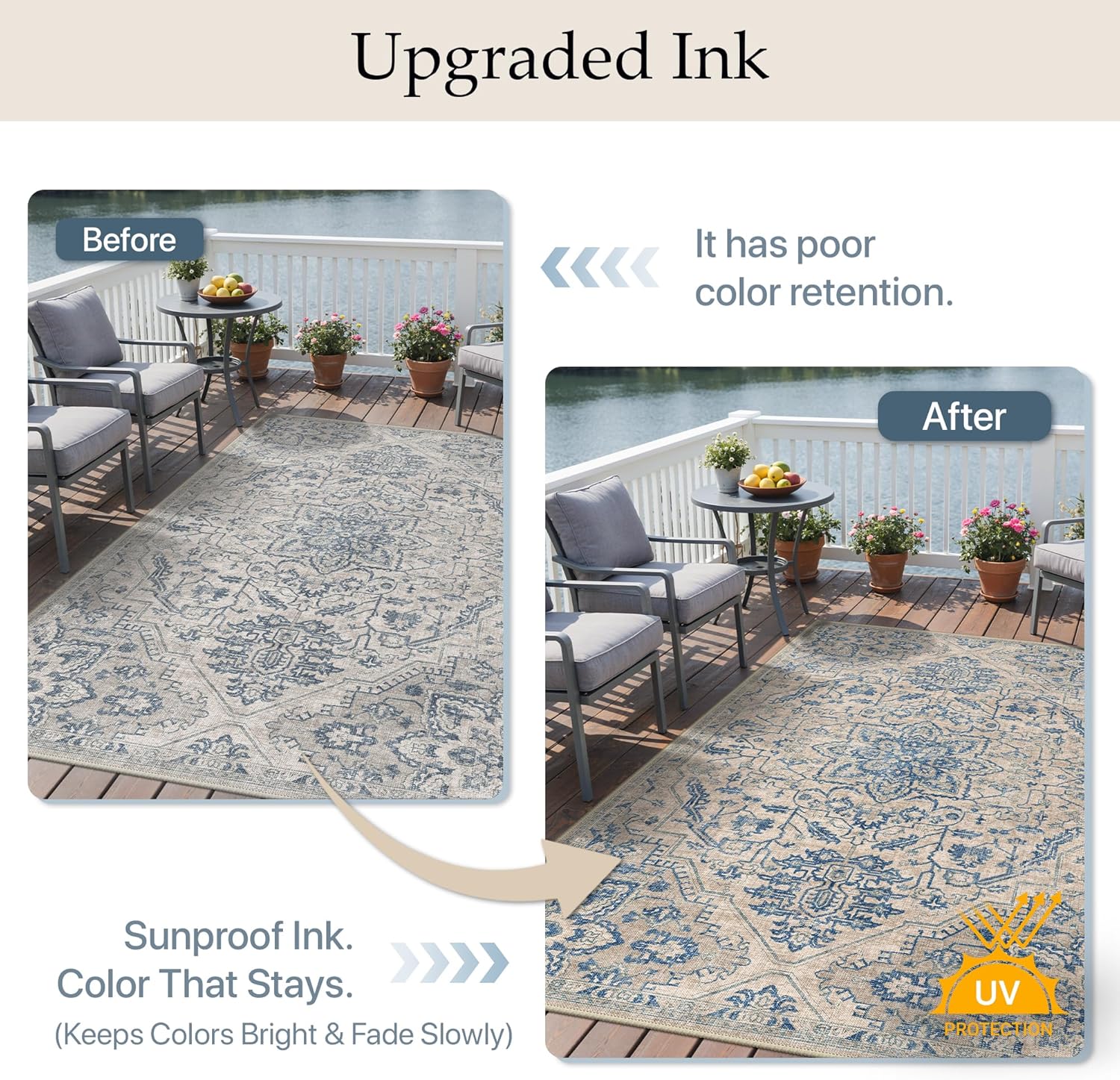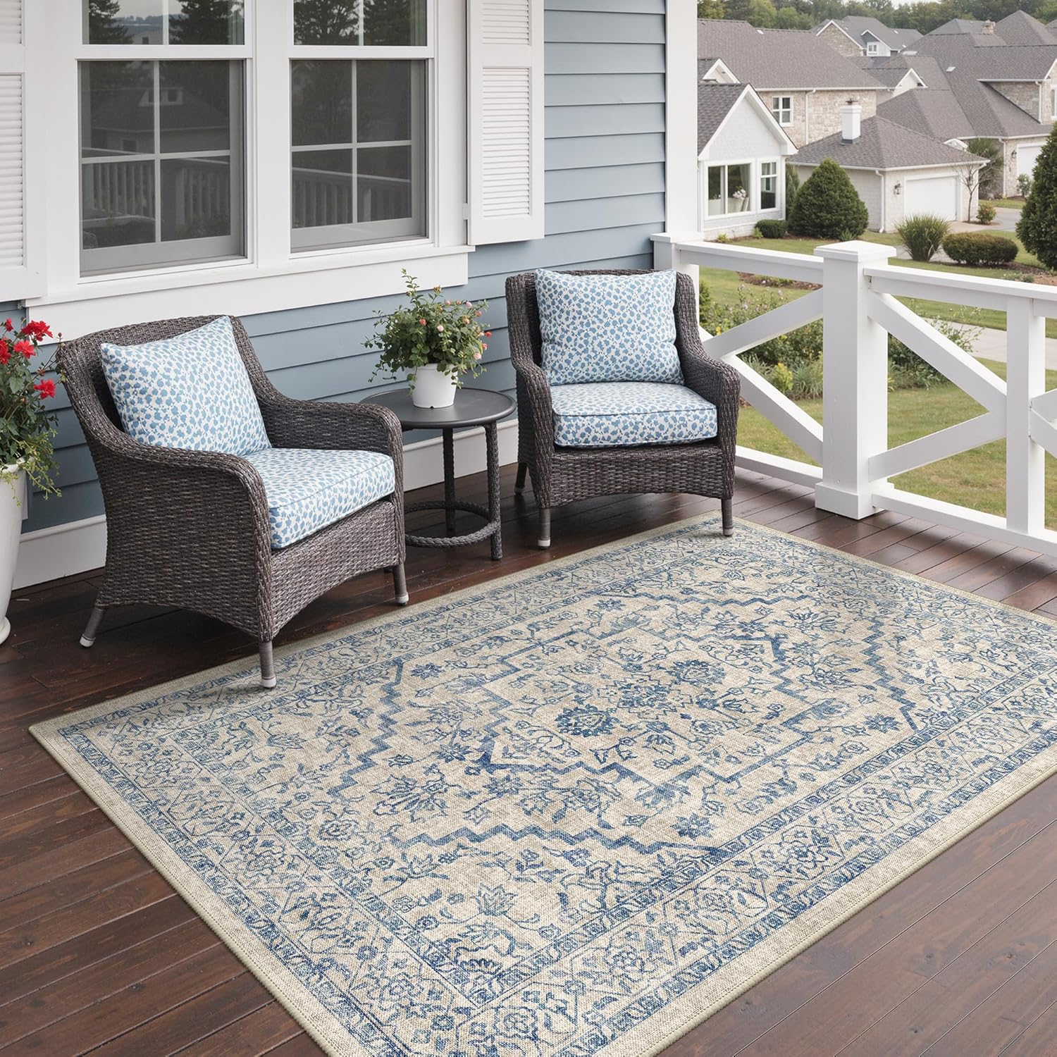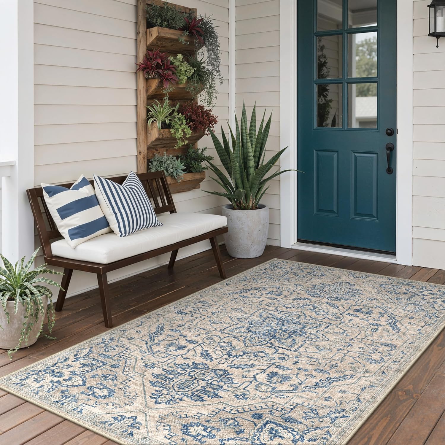 GENIMO Outdoor & Indoor Area Rug 5'x8', Waterproof, Non-Shedding, Easy Cleaning, Boho Front Door Mat for Patio, Entryway, Porch, Living Room, Bedroom, Bathroom, Outside Carpet Beige Blue