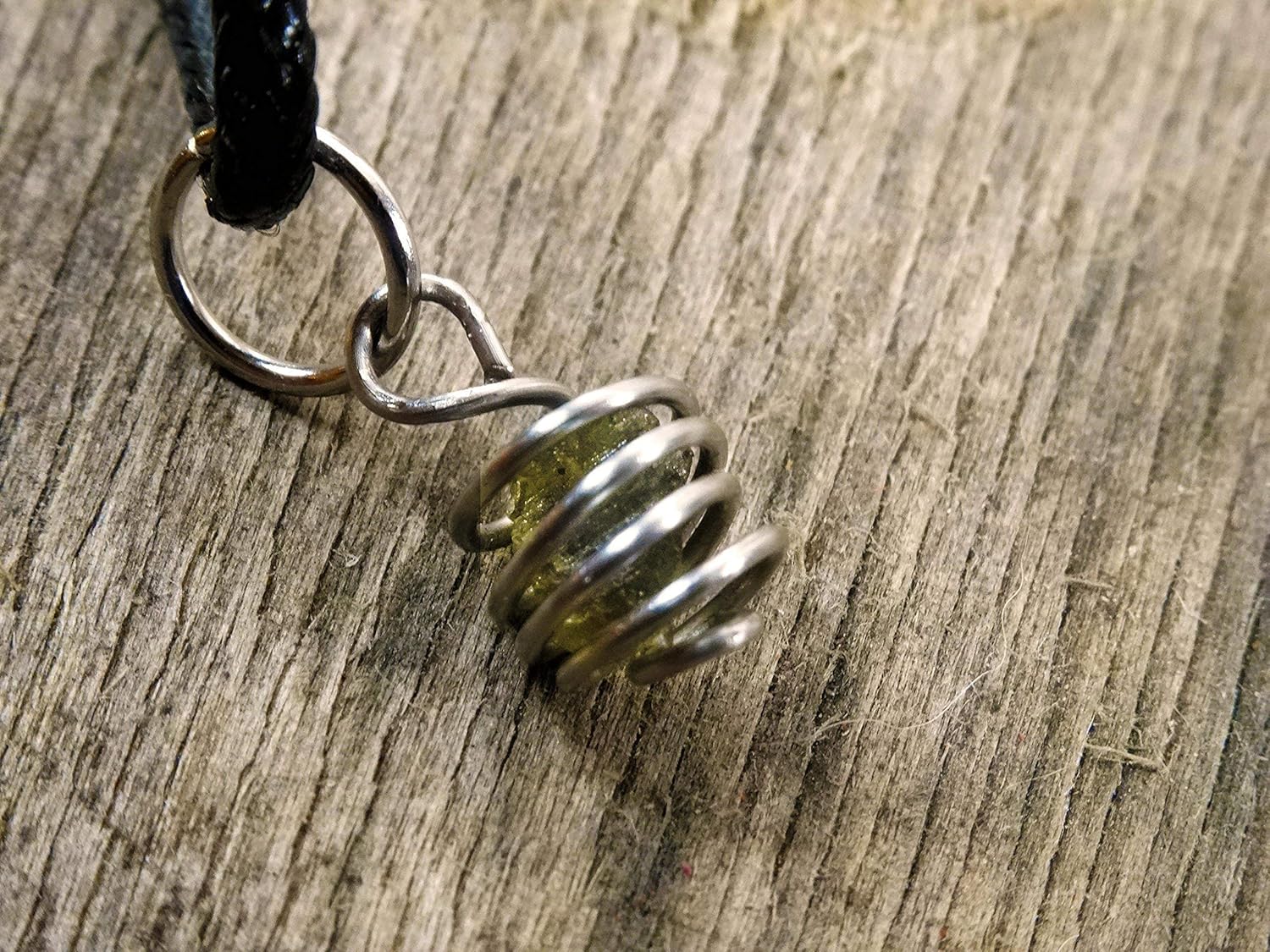 This is a beautiful moldavite pendant from the Czech Republic that has been wrapped in a in a wire cage that coils around the stone. This piece also makes a great bracelet charm, This cage pendant was created by creating a freestanding coil with a small bail on top and slipping the moldavite inside. (The basic option is Pendant ONLY)This elegant but minimalist wrap helps to accentuate the natural beauty of this otherworldly stone, creating a true showpiece. *Note - You will receive a pendant like the one pictured. As this is a production piece, each moldavite will be slightly different and housed in a cage hand wrapped to look just like the one in the picture. All moldavites used for this piece will be between 0.75ct and 1.5ct, being roughly the same size and shape as the moldavite pictured above. About Moldavite: A product of a meteor strike that took place in the Moldau Valley in what is now the Czech Republic more than 14 million years ago, Moldavite is a olive green tektite that was formed from the impact created by the heat and kinetic energy of the meteor striking the sand, creating a special type of gemstone that has some of the properties of desert glass, but others that are unique, with flecks of the meteor itself strewn throughout the stone. Moldavite is as incredibly rare as it is beautiful and is thought to be a powerful stone sought after by healers for its strange resonance and properties as well as gem enthusiasts around the world. All of our moldavite jewelry comes with a Certificate of Authenticity and is not made into jewelry until we have performed our own tests here at the shop. This is for the pendant only, if you want a necklace, upgrades are available. Measurements: Length: 0.75 "Width: 0.25 "Depth: 0.25"