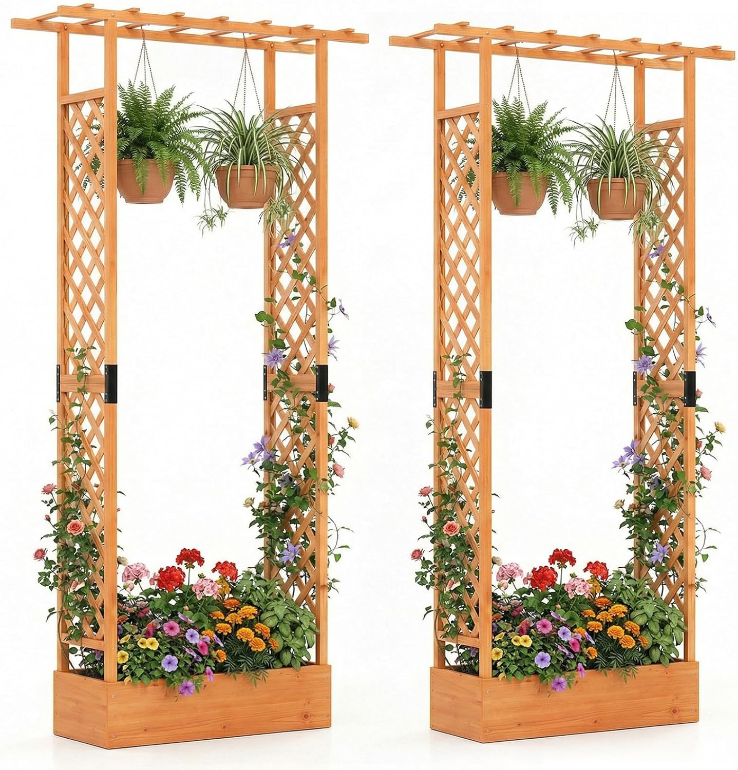Description:Bring the Beauty of Gardening to Your Living Space!Our raised garden bed is crafted from sturdy natural fir wood, providing lasting durability and a splinter-free finish that ensures safety. Several drainage holes ensure healthy root aeration while the detachable base panels offer additional flexibility for deep-rooted plants or larger crops. Enhance your patio, balcony, or yard with attractive vertical gardening - perfect for showcasing flourishing vegetables, vivid flowers, and trailing vines using the spacious container, dual lattice trellises, and handy hanging roof. Standing at 45” tall, this elevated planter is easy to assemble thanks to clear instructions and provides ample space to freshen up any living space with lush, eye-catching greenery.Features:Climbing plants flourish with robust lattice trellises for vertical supportFlat roof with wooden bars is ideal for hanging flower baskets and decorationsSuitable for cultivating various plants, vines, flowers, vegetables, fruits, herbs, etcSeveral drainage holes help roots stay healthy with excess water removedDetachable bottom panels make deep-root growing easy for larger cropsEntryways, patios, and balconies transform with the vertical planter’s beautySolid fir wood frame delivers lasting use for enhanced durabilityThe wood surface is painted with a protective finish, enhance its service lifeThrough delicate craftsmanship, the wood surface is splinter-free and safeMetal brackets reinforce the bed for exceptional stability and supportSpecifications:Color: Natural/OrangeMaterial: Fir WoodProduct Dimensions: 87” x 14” x 45” (L x W x H)Interior Size of the Planter Box: 76” x 13” x 7” (L x W x H)Weight Capacity: 110 lbsNet Weight: 22.5 lbsPackage Includes:1 x Wooden Raised Garden Bed1 x User’s Manual