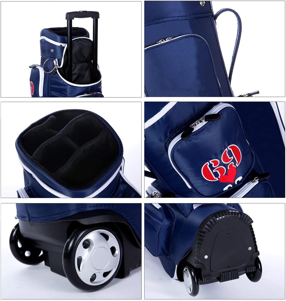 Golf bag club bag | equipment bag | women's standard golf bag | trolley bag with wheelsFeatures:1. Men/women large tug trolley light golf bagThe separate design of the head frame allows the clubs to be sorted neatly, and the flannel is used to wrap the grid to reduce the frictional damage of the clubs.2. Telescopic rod designTie rod design, easy to carry, press the top button can be freely retractable, can easily pull the bag.3. Twist the gripTwisted hands are meticulously made, comfortable to grip, wear-resistant and not easily broken4. Multiple attached bag designThe side zipper bag can hold small items such as gloves, spikes, golf balls and so on. The bottom storage bag can hold large items such as golf shoes.5. Hard and stable pulley baseOne-piece molding, large tug design, heavy load, easy to pull.Product parameters:Name: Golf bag with pull rod pulley tugspecification:Length: Height 91cm×Width 25cm×Length 40cmBag weight: 3.9kgHeight with ball cap: 128cmSite Diameter: 25cmPlug hole: 5 gridsLength of the bag: 40cmBall diameter: 10cmPacking list: 1*golf club bags