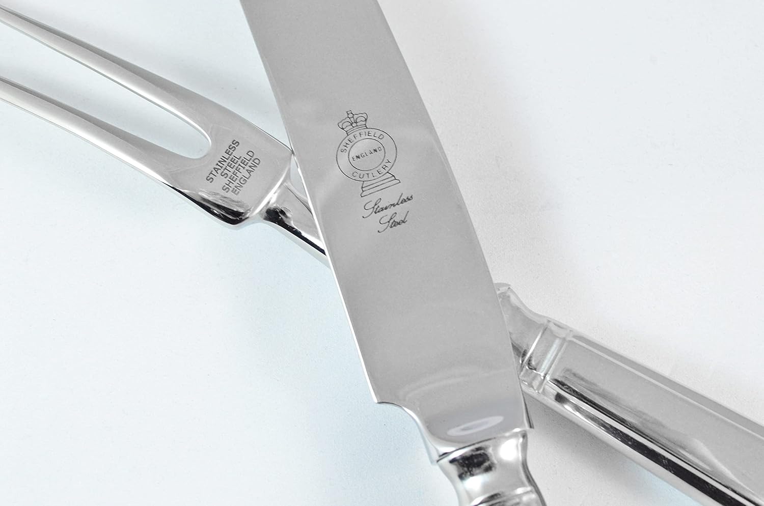 Welcome to The Sheffield Cutlery Shop – High Quality Cutlery, Knives, Silverware & accessories all made in Sheffield, England. We stock only the highest quality items made from professional-grade materials, carefully finished by true Sheffield craftsmen. Genuine Sheffield Steel 18/10 Heavy Gauge Metal Handmade In Our Sheffield Factory Wooden Presentation Case Made in Sheffield England from Stainless Steel. All of our Stainless Steel Carving Sets are hand polished by our craftsmen to a high mirror finish. This set bears the Grecian pattern. The blade is stamped ‘Stainless Sheffield England’, along with the back of the fork also bearing the ‘Stainless Steel Sheffield England’ mark. The Carving Knife measures 360mm long and weighs 180 grammes. The Carving Fork measures 290mm long and weighs 180 grammes. Presented in a fantastic handmade wooden case.