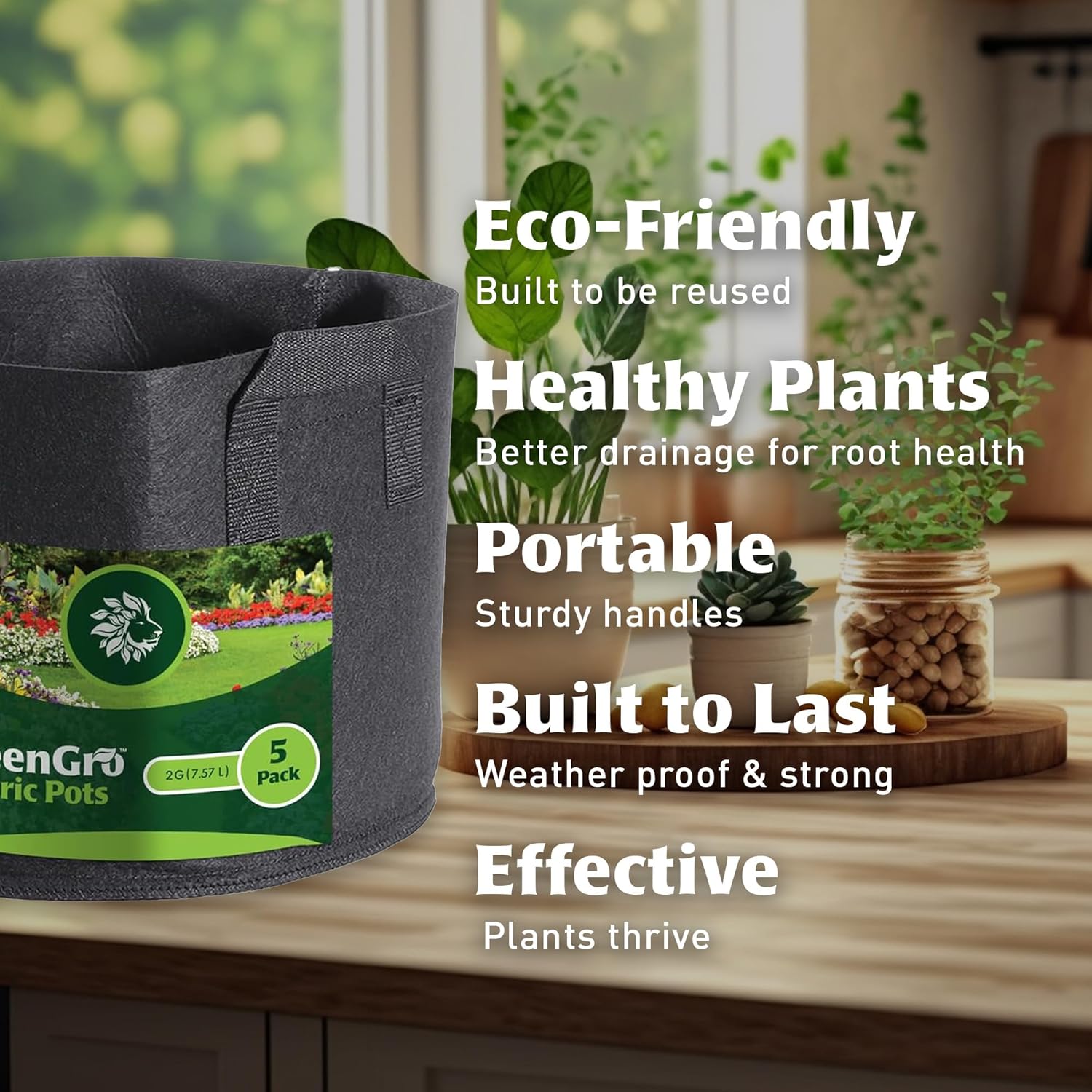 GreenGro's 5-pack Grow Bags, the versatile gardening solution that meets the needs of both novice and expert gardeners. Available in 2 and 5-gallon sizes, these fabric pots are a one-stop solution for growing everything from vegetables and herbs to flowers and small trees. Designed with cutting-edge fabric technology, our bags promote excellent aeration and drainage, eliminating the risks of overwatering and root rot. Why choose GreenGro? Convenience and portability are built into our design. Each bag features sturdy handles for easy relocation, so you're not confined to one spot. When not in use, these lightweight, foldable bags can easily be stored, replacing the need for bulky plant containers or fixed grow boxes. Root health is crucial for plant growth, and GreenGro Grow Bags are designed to optimize it. The fabric promotes natural air pruning, which prevents your plants from becoming root-bound, resulting in stronger, healthier plants. This isn't a short-term solution; these bags are built to last. Crafted with premium fabric to withstand various weather conditions, our grow bags are both reusable and long-lasting. Whether you're growing a vegetable garden, nurturing herbs, or cultivating flowers, GreenGro Grow Bags provide the optimum environment for plant growth. Make the smart choice and invest in the health and yield of your garden today.