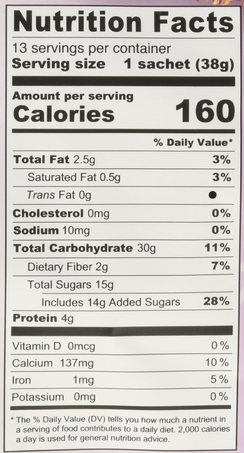 Instant meal/hot cereal with high in dietary fiber, high in calcium & iron, vitamins & minerals, rich in vitamin A, B1, C, and contains vitamin B2, E. A package with powder, healthy choice.