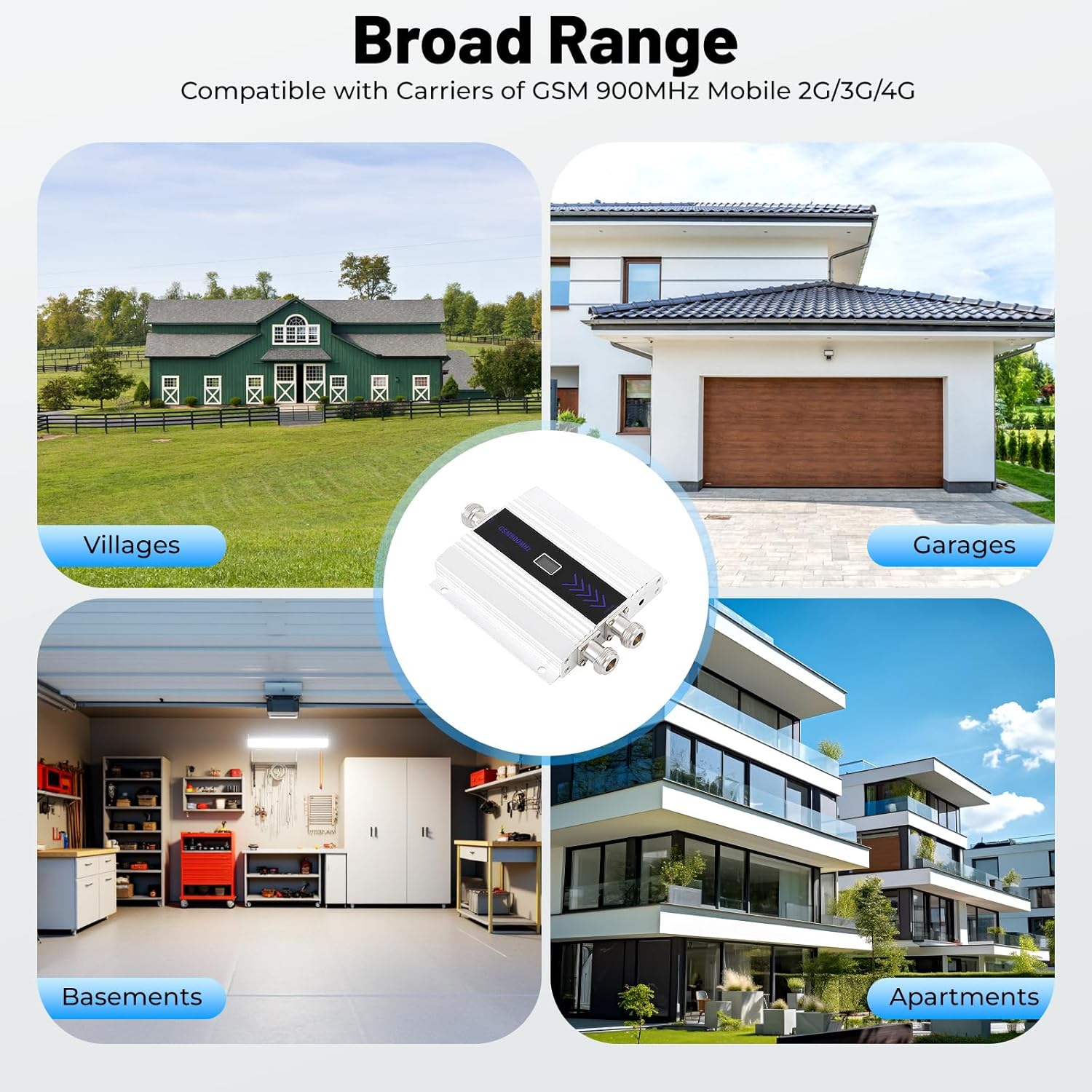 Description:A mobile phone signal repeater provides an ideal solution in any area where cellular communications can not work well due to a lack of signals. Our product features a compact design, lightweight, can effectively improve indoor electromagnetism environments, enhance mobile phone signal strength, and so on.Application:The phone signal repeater is compatible with all carriers of GSM 900MHz mobile 2G/3G/4G. It is used for villages, garages, basements, homes, and so on.Specifications:Material: AlloyShape: RectangularMounting Type: Wall-mounted, Bracket FixingNetwork System: GSMVoltage: 110-220VFrequency: 45-55HzImpedance: 50ΩSeclusion: >65dBPower: 1.23MHz, -70 ~ -40dBm/FAFrequency Range: 890-915 MHz(Uplink), 930-960 MHz(Downlink)Dependability: GB6993-86 Standard Transmission Delay: <0.5Noise Index: Less than 4dBPass Band Ripple: Less than 3dBMajor Exporters(PO): More than 10dBmIndoor Antenna Gain: 3dBOutdoor Directional Antenna Gain: 8dBBoost Gain (dB): Gp > 58, Gp > 55Applicable Area: 50-200m²/538-2152ft²Ambient Temperature: -10-60℃/14-140℉Outer Antenna Length: 10m/32.8ftProduct Size: 140*100*20mm/5.51*3.94*0.79inPackage Size: 48*20*15cm/18.90*7.87*5.91inGross Weight: 1.3kg/2.86lbsPackage Included:1* GSM 900Mhz Repeater1* Outdoor Aerial2* Indoor Aerial1* Charger1* English ManualNotes:1.Please test the frequency band of your mobile phone before purchasing.The call can support 2G/3G/4G, and the network can only support 2G.2.Please make sure the distance is above 6m/19.68ft between the indoor and outdoor antennae, it better divides one from another by a wall. Please be sure that there are good signals 4-5 bars on your outdoor, or it will not work in your room.