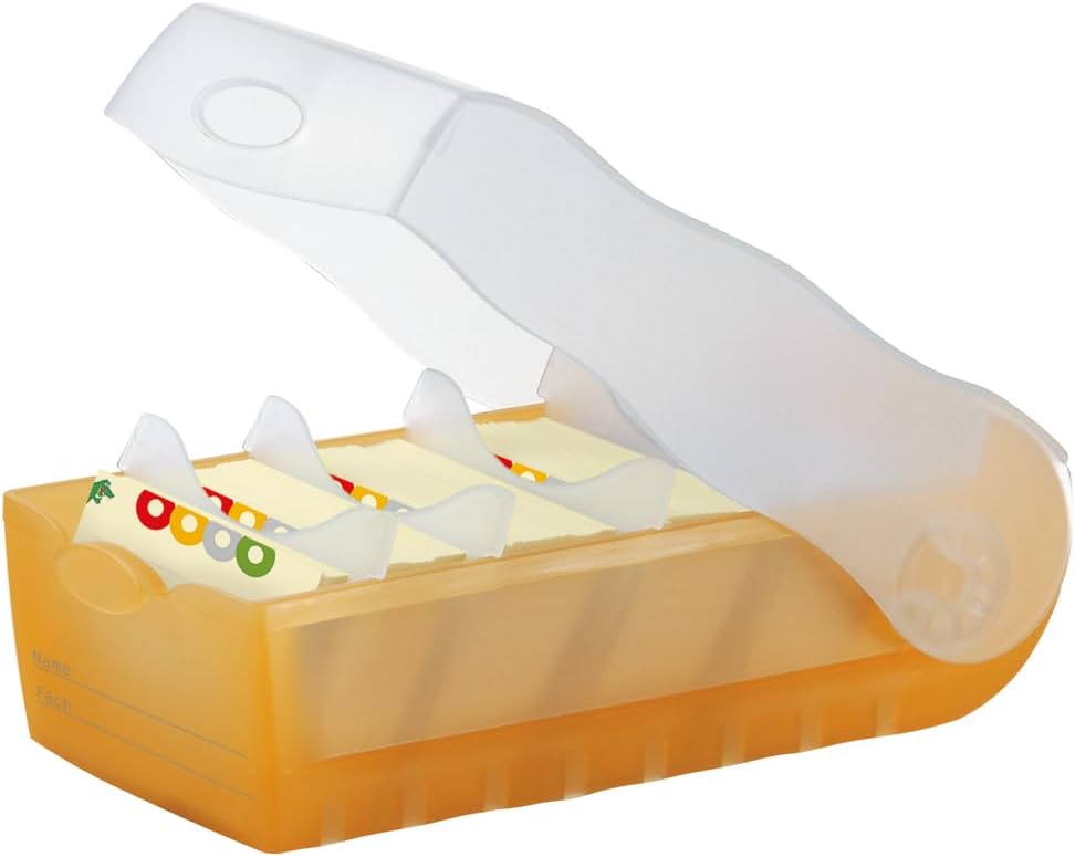 Card index box CROCO A8 landscape, holds 100 cards. 100 ruled record cards (Item 9812), 5 variable dividers (Item 9028) and large inscription label included. Ergonomically designed, practical in use, versatile in application: ideal as flash card system. The learning principle is just as simple as it is effective. Is also suitable for a storage box for small items. When open, the lid slides underneath the box; when closed, the dividers are locked. Optional accessory: guide cards A-Z (Item 9872). Storage capacity: 100 cards. Use with card format: A8 , landscape. Size (W x D x H): 97 x 191 x 67 mm. Material: high-quality plastic, polyproylene (PP). Colour of base: translucent blue. Colour of the lid: translucent clear.