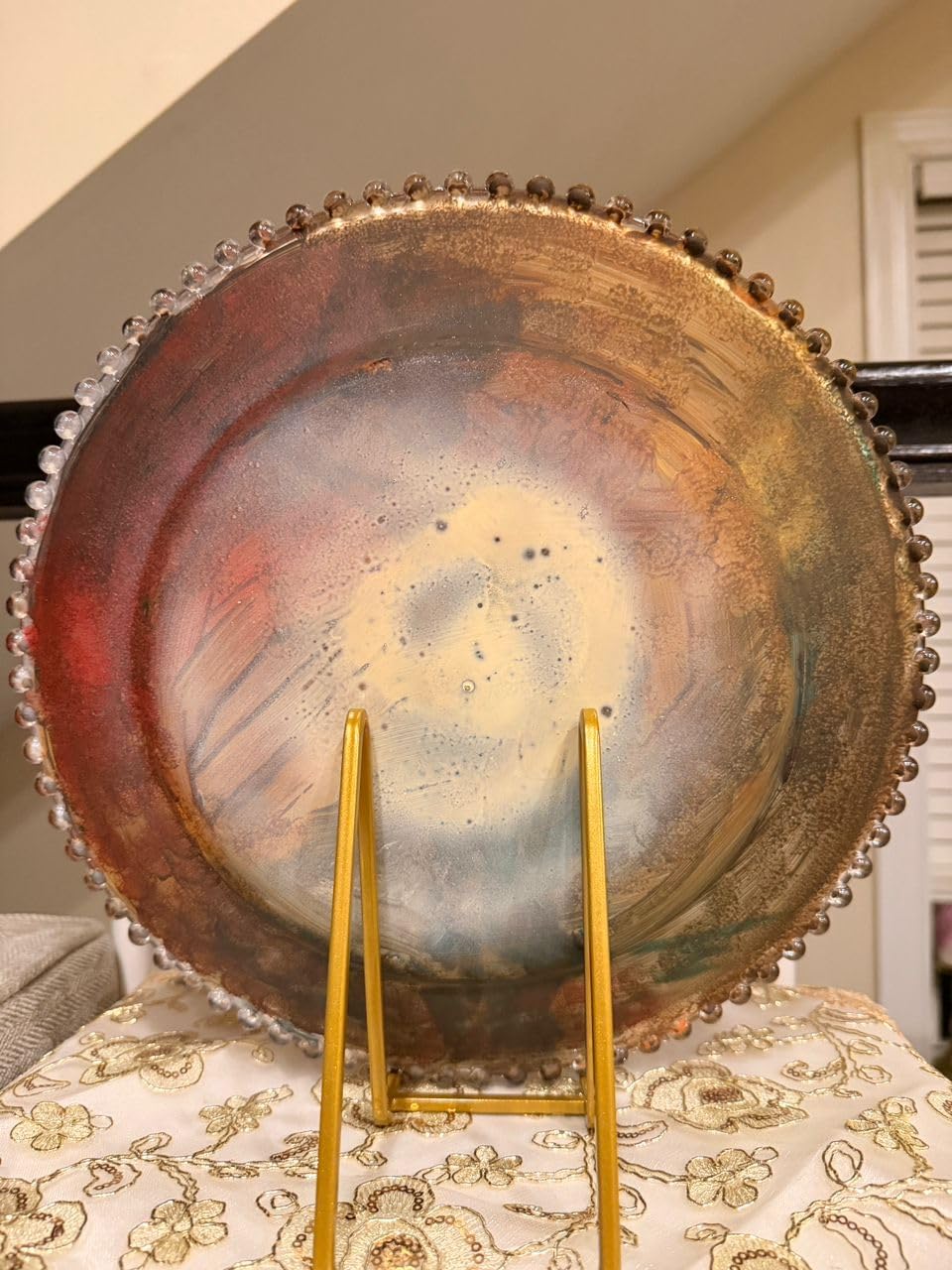 Bring home the charm of cultural artistry with Grace of the Harvest, a stunning hand-painted decorative plate that beautifully captures the spirit of grace and abundance. Featuring a woman draped in a flowing blue garment carrying a bowl of golden fruits, this artwork radiates warmth and serenity. The background’s rich sunset hues, reflective metallic surface, and elegant beaded rim make it a captivating centerpiece for any home or gallery space. Perfect for art lovers, collectors, or as a meaningful gift symbolizing hard work and prosperity.