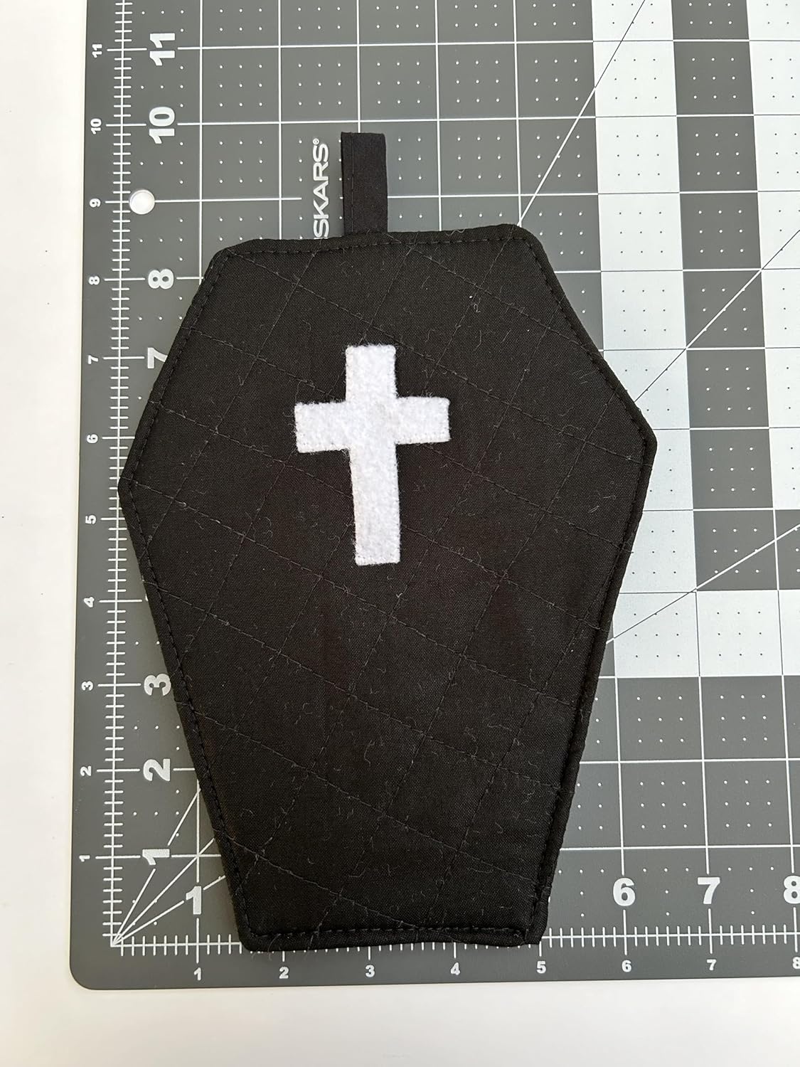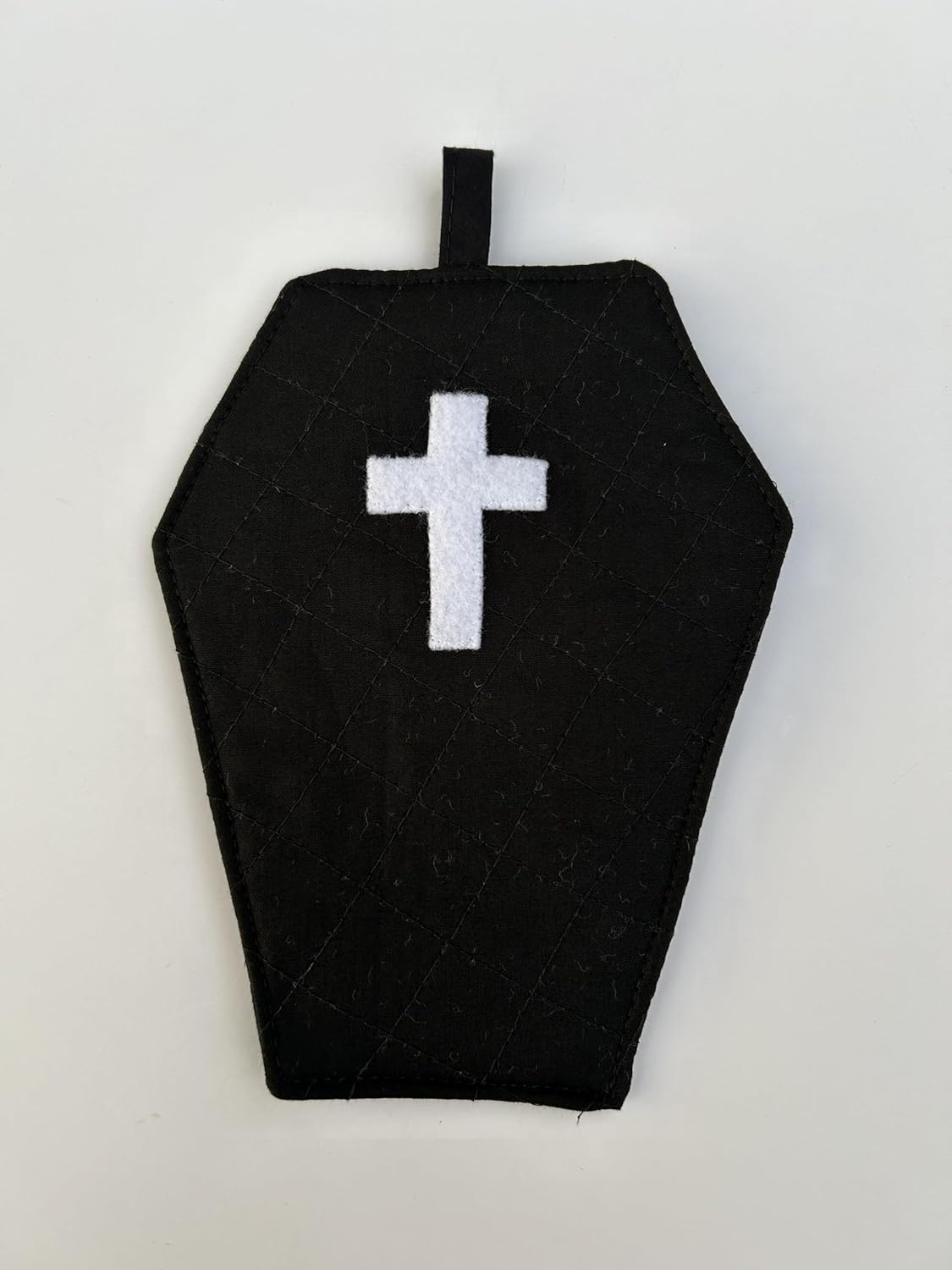 These spooky and unique Coffin Halloween potholders/hot pads/oven mitts are useful and make beautiful and creepy decorations for your kitchen. They are quilted with 100% cotton fabrics, cotton batting, Insul-bright (insulated lining); cross detail is made of felt and machine stitched onto it. Each one measures about 6.5” wide and 9” tall. Each set consists of 2 coffin shaped hot pads/oven mittens. Let me know if you have any questions. Happy Halloween!