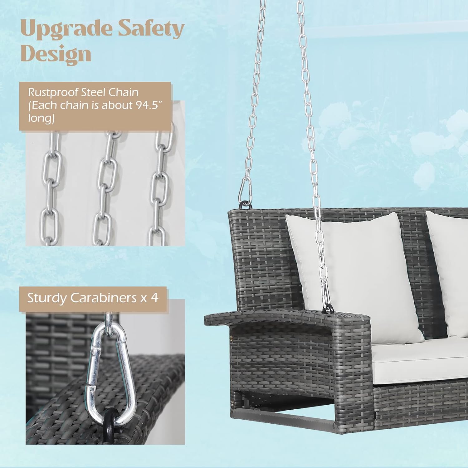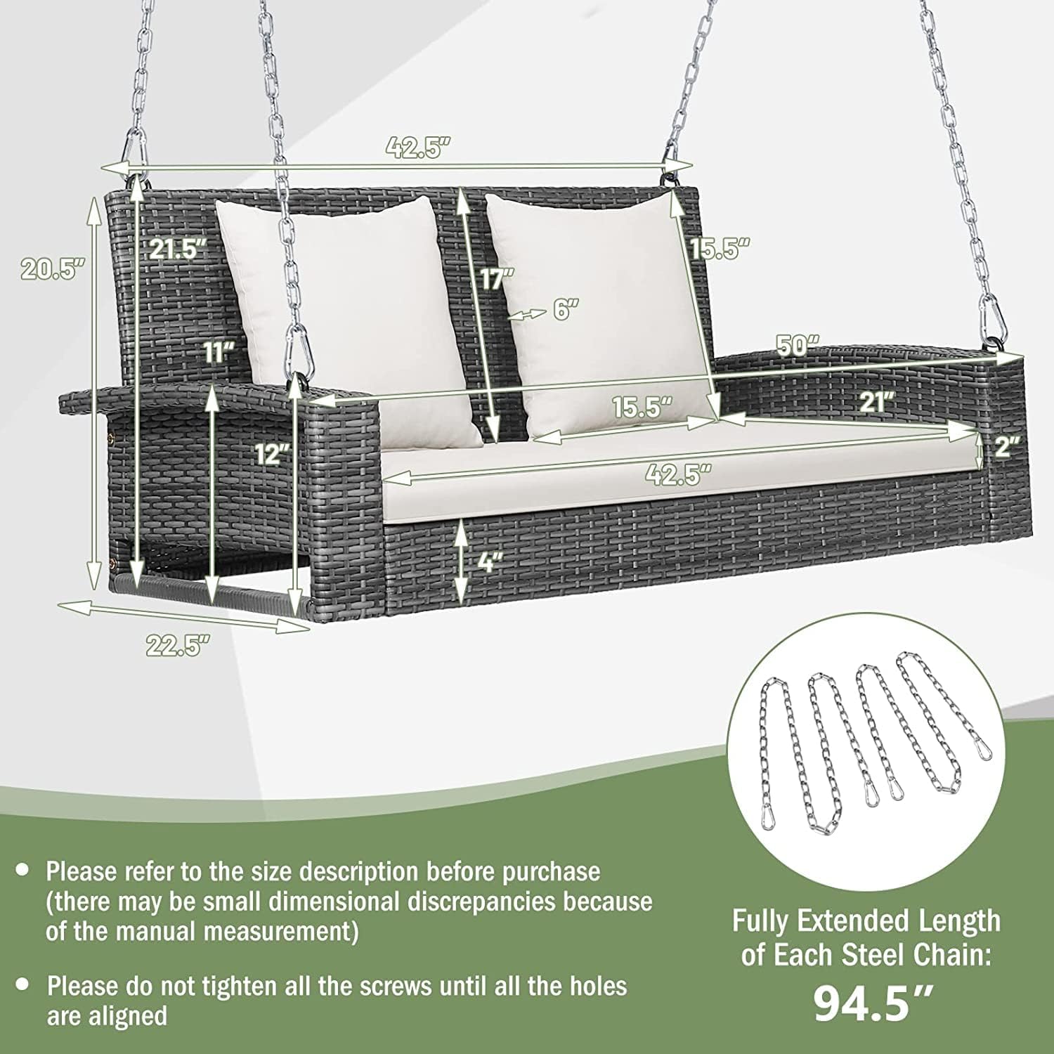 Enjoy the happy outdoor leisure time with your friends and family by relaxing on our 2-person wicker hanging swing bench! The wide seat and 3 breathable cushions offer an incredibly comfortable sitting experience, which can accommodate 2 people to sit together and enjoy the beautiful weather or have a cup of coffee. It is worth mentioning that the weather-resistant PE rattan and reinforced structure will provide years round of use. Besides, ergonomic backrest and armrests offer strong support for your body. Please refer to the size description before purchase (there may be small dimensional discrepancies because of the manual measurement). Please do not tighten all the screws until all the holes are aligned.