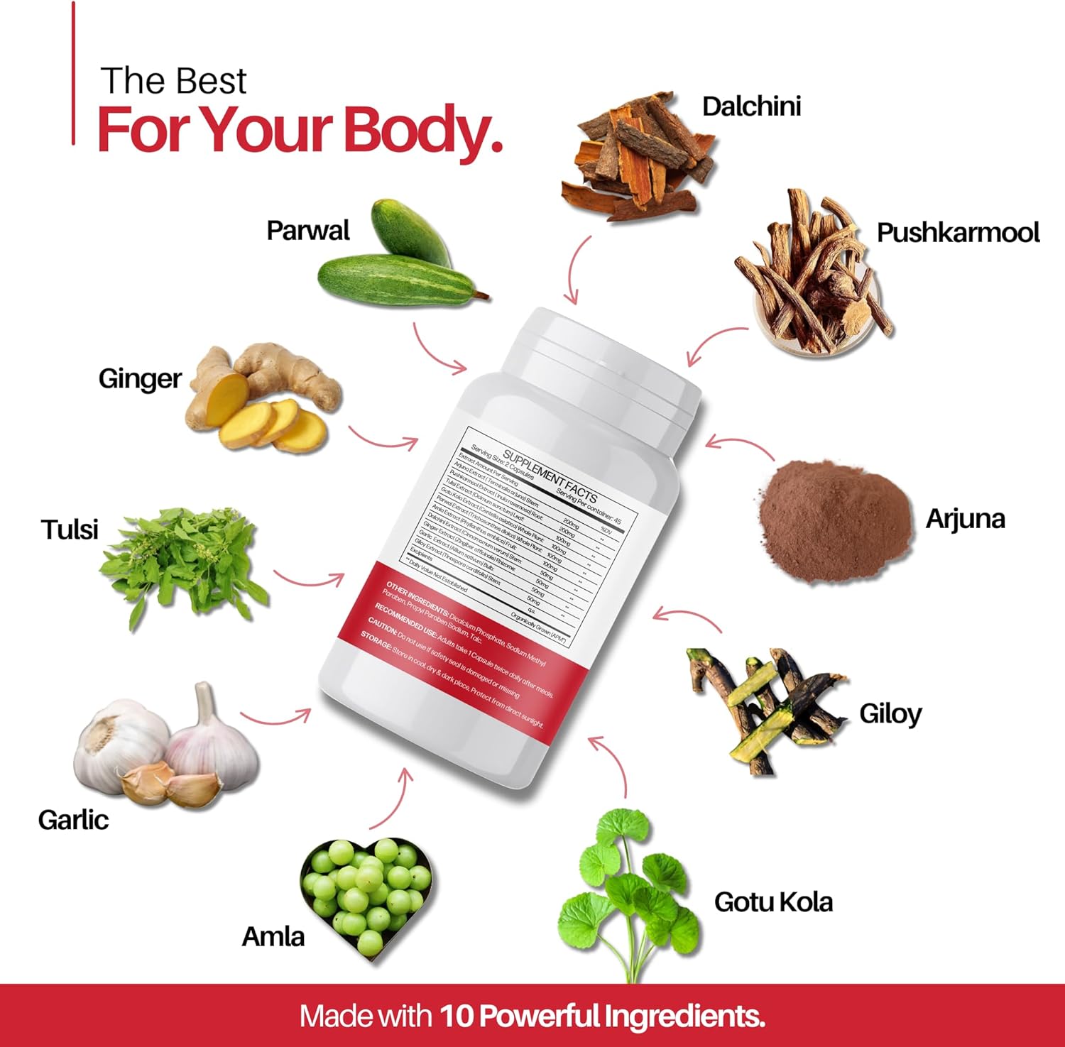 Special Ingredients Arjuna, Pushkarmool, Tulsi, Gotu Kola, Parwal, Amla, Dalchini, Ginger, Garlic, and Giloy