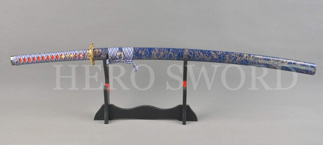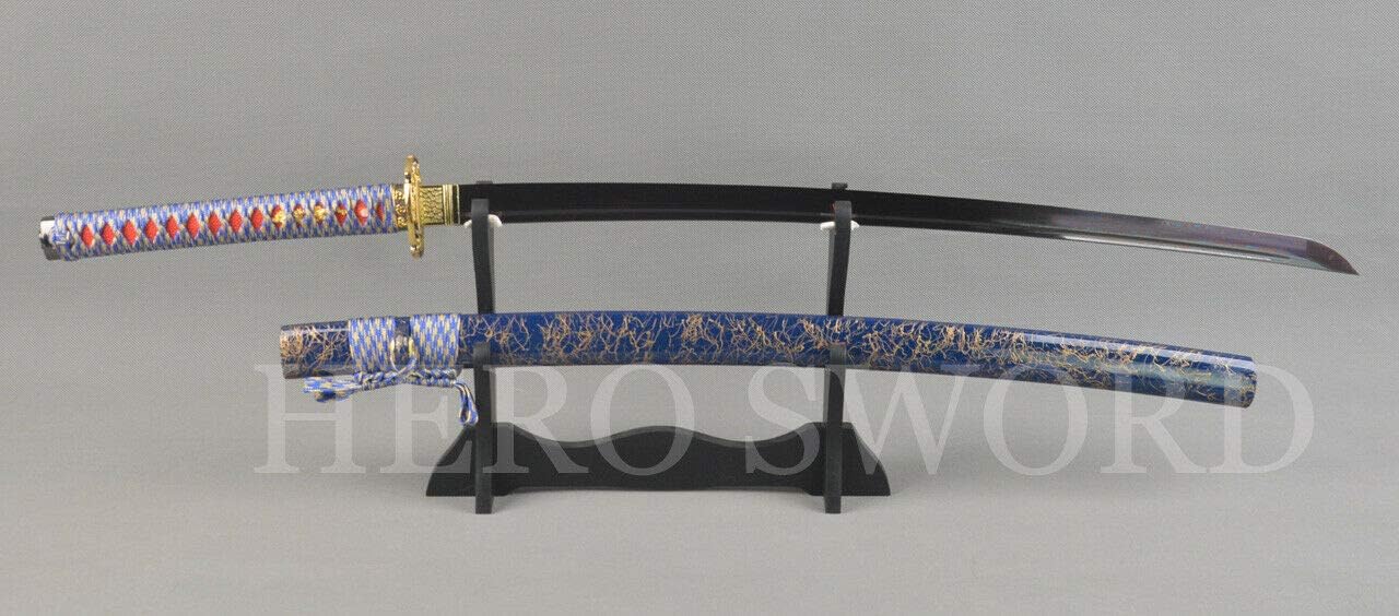 SpecificationBlade material ;Damascus Folded steel HRC ;58 Tang; Full tang Sharpness ; can cut trees and bamboo Bo-hi;with long hi on the each side of the blade Kissaki;Chu-kissaki overall length ;103cm/40.55 inches blade length ; 70 cm/27.56 inches handle length ;26cm/10.24 inches blade width ; 3.2cm/1.26 inches tsuba material ;alloy Kashira/Fuchi/menuki material ;alloy handle material ; hard wood + silk ito + ray skin saya material ; hard wood+silk sageo Conditional ;brand new gift ; black sword bag Note;below sword picture show black sword stand not included