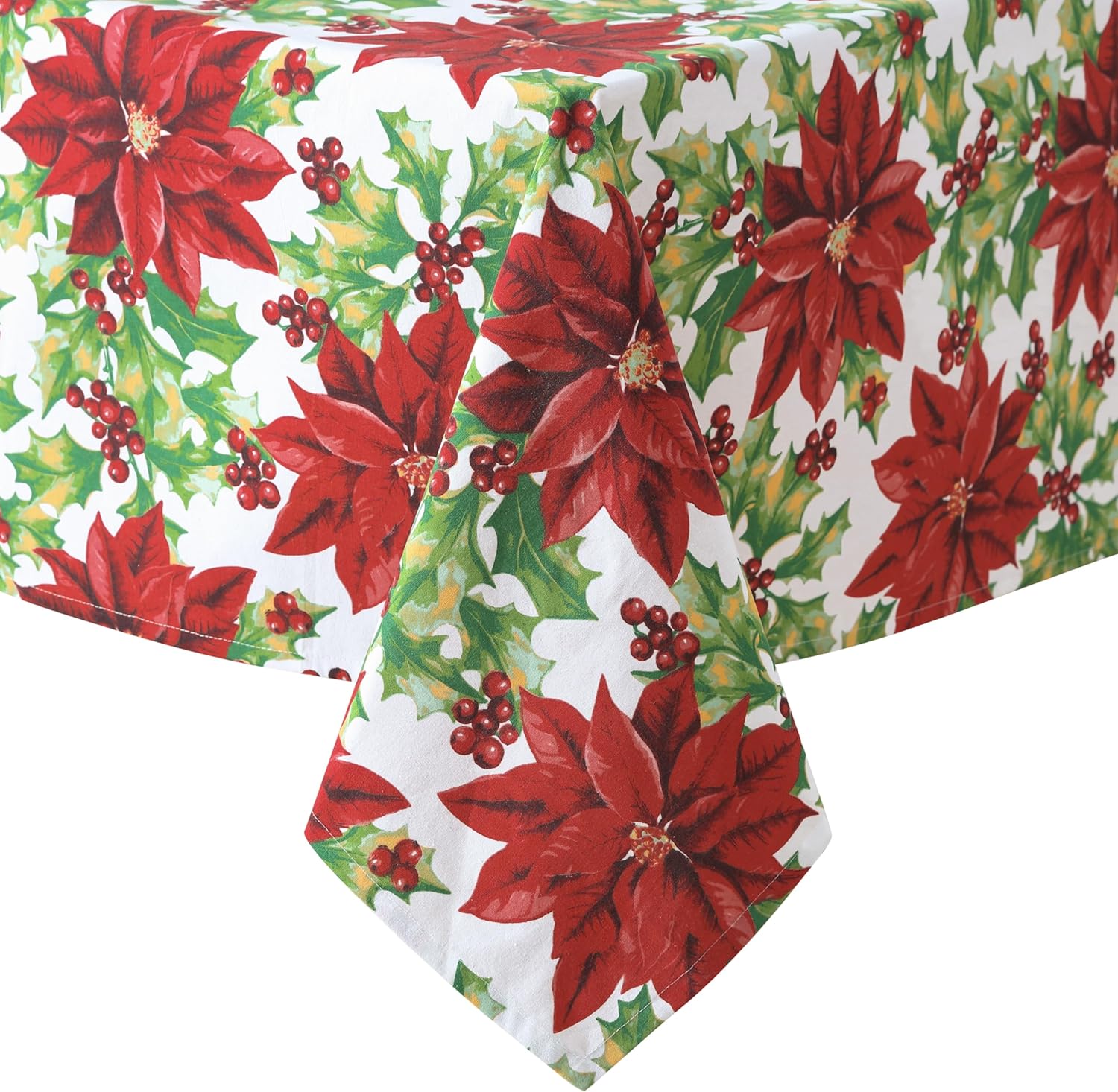 Celebrate the season with the timeless elegance of the Lintex Poinsettia Christmas Fabric Tablecloth. This festive table cover features a bold all-over print of vivid red poinsettias, accented by sprigs of holly, green leaves, and red berries, set against a crisp white background. Perfect for traditional and contemporary settings alike, the vibrant floral pattern instantly transforms your dining table into a cheerful holiday focal point. Made from high-quality fabric (non-cotton), it offers a soft feel with reliable durability for repeated seasonal use. Whether you’re hosting a formal Christmas dinner or a casual winter gathering, this tablecloth adds warmth, charm, and joy to every celebration. Easy to maintain—just machine wash and enjoy year after year.