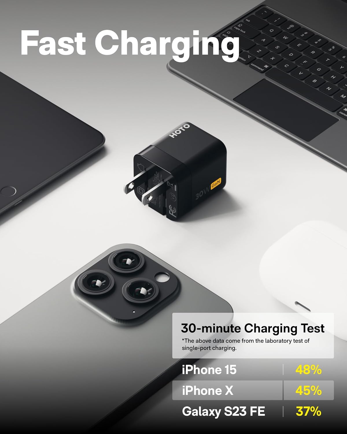 Feature:- Powerful 30W Charging:The powerful 30W charging function greatly improves your charging efficiency and brings you the ultimate experience- Super Compact and Lightweigh: Exquisite lightweight,perfect for traveling, business trips- Safe Charging:The GaN II Technology reduces heat during charging and effectively prevents over-voltage, overheating, and short-circuits, ensuring safety for youand your devices- High-band width Data Transfer:Comes with a 3.3ft USB Type-C to Type-Ccable, supporting fast charging and high-speed data transfer at a speed of 480mbps - What other devices does this product adapt to??Compatible Devices :HOTO Electrictools, for example: HOTO Electric Screwdriver Series, HOTO Flashlight Series, HOTO Smart Laser Measure, HOTO GlueGun, HOTO Compressed Air Capsule,etc.Package List :1x HOTO 30W USB C Charger1x 3.3 ft USB Type-C to Type-C cable