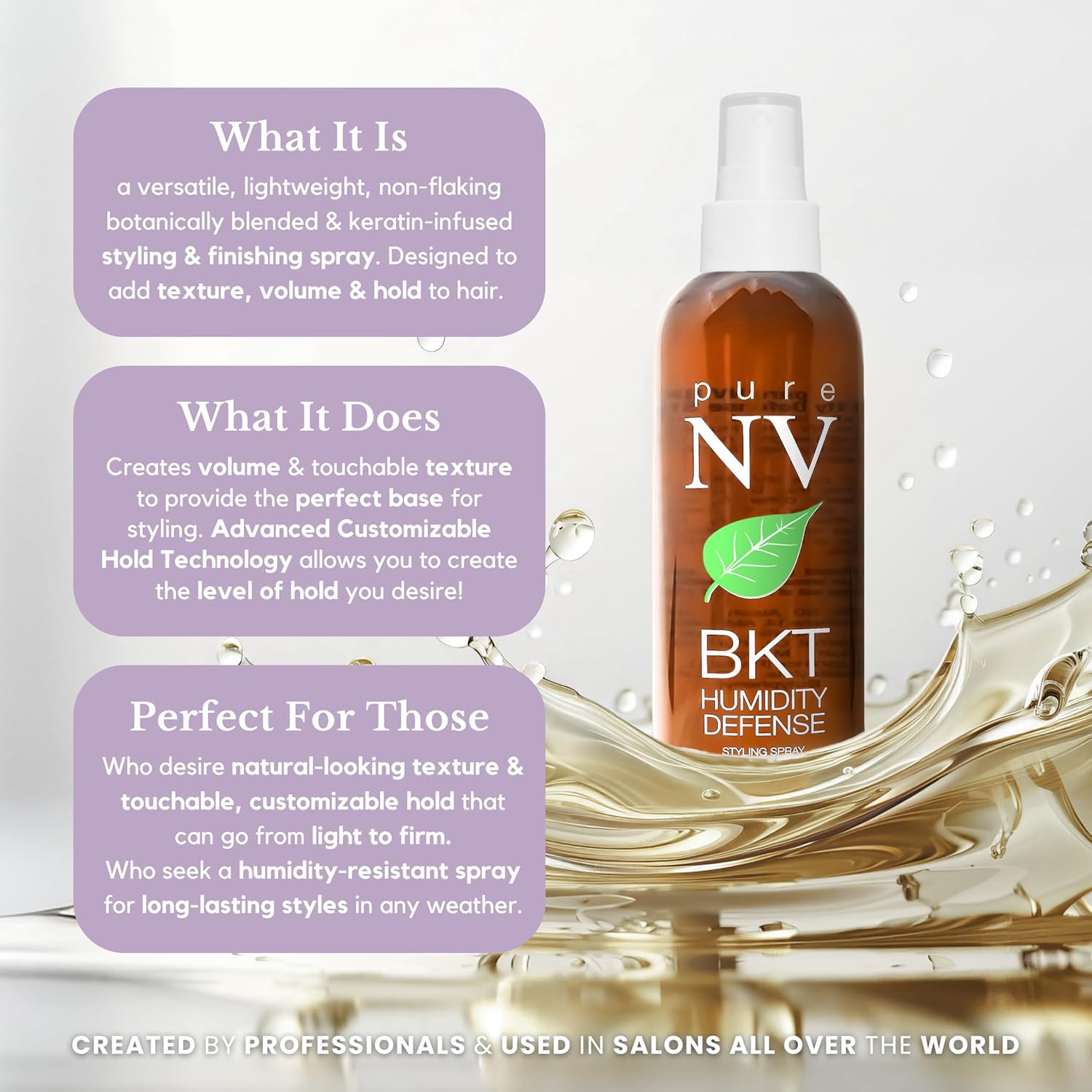 Keep your hair frizz-free, smooth, and protected no matter the climate with Pure NV Humidity Defense Styling Spray—a keratin-infused, weightless styling mist that acts as a humidity shield for your hair. Formulated with Nature’s Vitamins (NV Complex), this advanced anti-frizz spray blocks out moisture, tames flyaways, and maintains sleek, touchable styles in any weather. Lightweight yet powerful, it forms an invisible barrier that repels humidity without weighing hair down or leaving behind sticky residue. Infused with hydrolyzed keratin, argan oil, and botanical extracts, this formula strengthens, nourishes, and enhances shine, leaving hair feeling soft, silky, and polished. Whether you’re fighting frizz in high humidity, prepping for a flawless blowout, or sealing in curls, this professional-grade styling spray is a must-have for frizz-prone, color-treated, or chemically processed hair. Key Benefits: Blocks humidity and prevents frizz for long-lasting, sleek hair Protects against heat styling while adding shine and softness Keratin-infused formula strengthens and smooths strands Lightweight and residue-free for touchable, natural movement Works on all hair types, including straight, wavy, curly, or coily textures