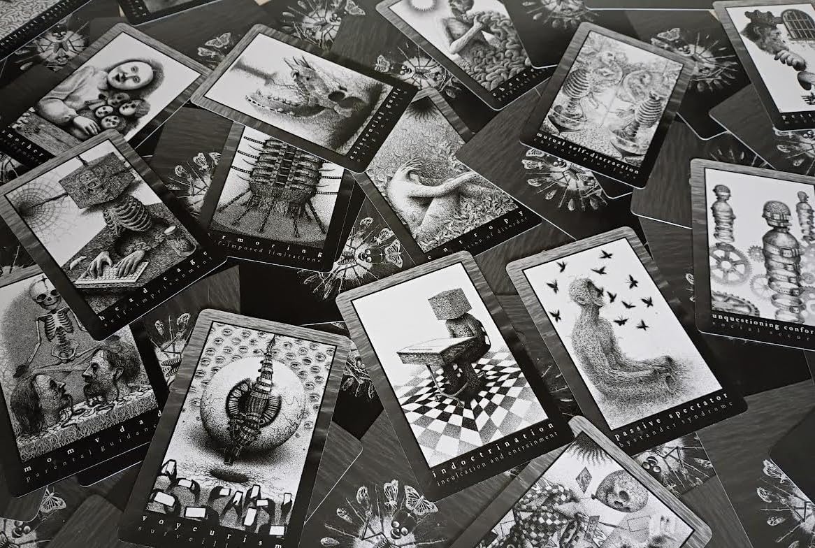Hungry Ghost Realm is a 60-card illustrated deck paired with a 132-page companion booklet. It examines the ways we deceive ourselves — the distortions, blind spots, and cultural patterns we carry — through elements of horror, satire, and symbolic reflection. This is a creative tool, not an oracle deck nor a reference to the Tibetan hungry ghost concept. The cards can be used for self-directed spreads, journaling, or any personal practice that benefits from symbolic prompts. Each image and description is open-ended by design, meant to encourage the viewer to question their own reactions rather than follow a fixed interpretation. All artwork is hand-drawn with pen and paper. No AI, photo-bashing, or digital rendering were used beyond basic contrast adjustments for print clarity.