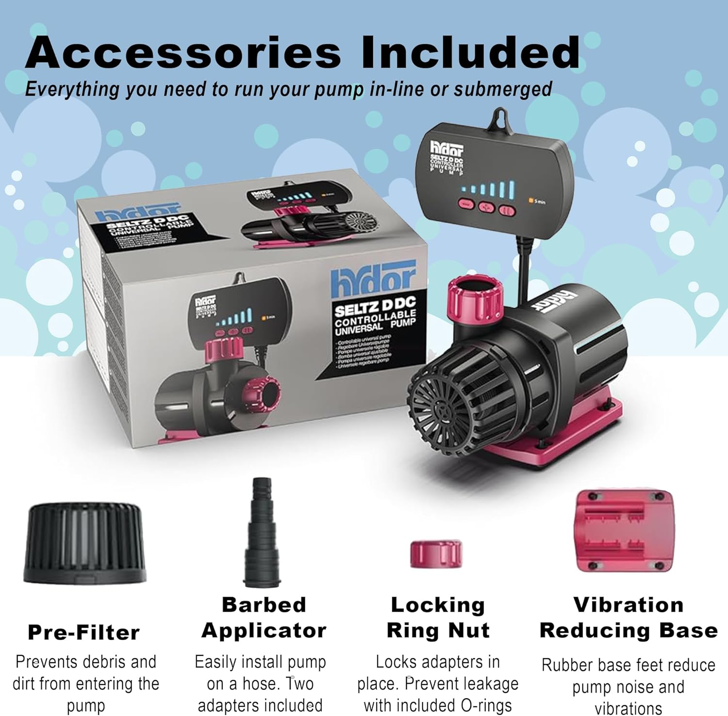 Hydor Seltz D DC Controllable Universal flow water pump. Whether you are a marine hobbyist or a passionate freshwater aquarist, know that Hydor’s Seltz D DC Controllable pumps are the perfect fit for your aquarium needs. The pumps feature innovative 6 pole electronic motor for energy savings. The pumps are controllable through the enclosed electronic controller to increase or decrease the flow at 6 preset points and has a feeding mode to pause the flow of the pump for feeding or maintenance inside the aquarium. The pumps can be used in-line or submerged, they are equipped with sensors that detect the presence of water moving through the pump so it will shut off the pump to prevent damage if no water is sensed. This space-saving DC Universal water pump features gallon ranges from 500 to 1000 and will pump head heights of 12.5 feet, depending upon the premium model you choose from Hydor. Use in freshwater or saltwater aquariums, bringing the best of aquarium technology to your home or office. It’s simple to use