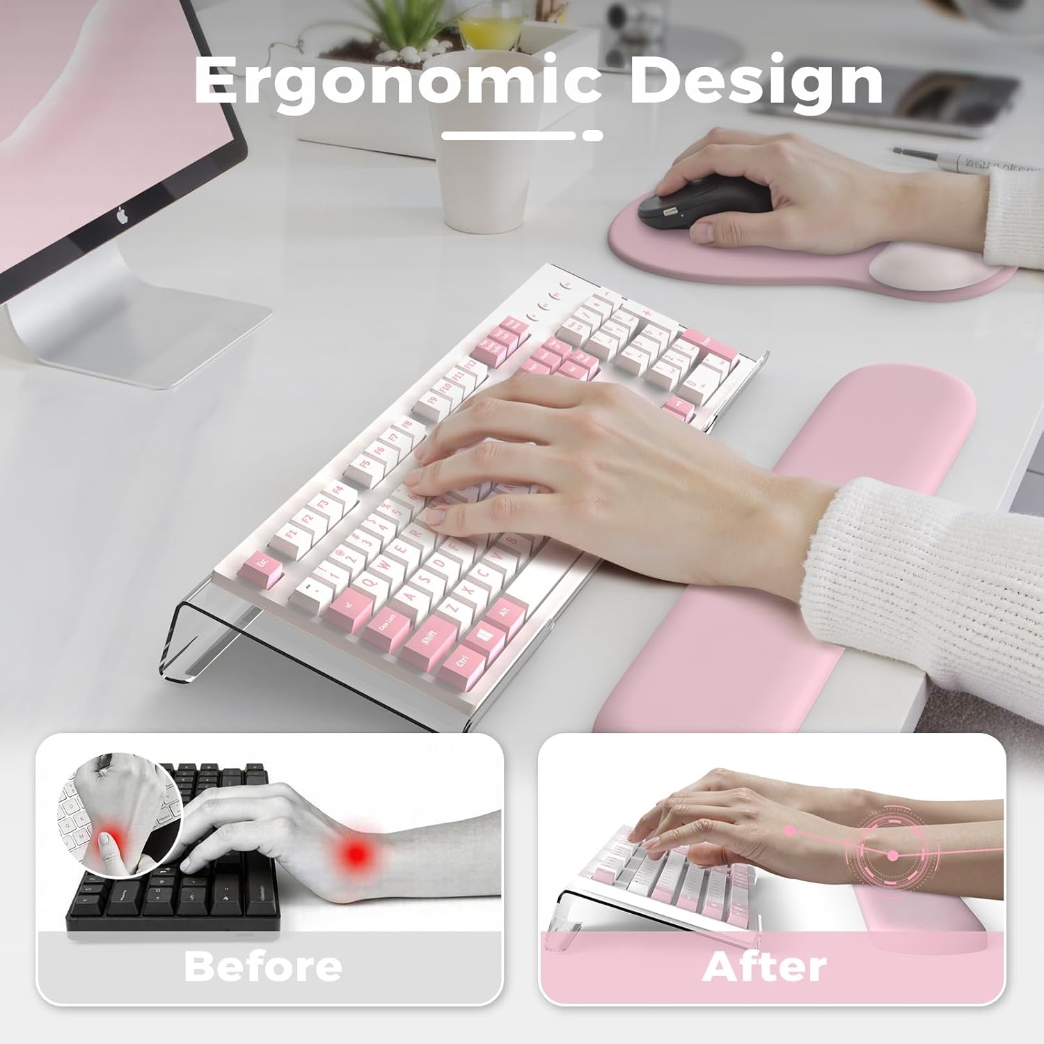 Why choose us out of manyproducts? Unique design of massage holes !Innovative ergonomical design, fits to wrist and palm when put yourwrist on the mice wrist support cushion, feel comfortable to rub your wrist andpalm against to them.Great present for your family friends or yourself. Office Table Computer Feature:-Ergonomic shape and just the right heightkeep your wrist in a natural position rather than a twisted angle.-Non-slip textured bottom with the naturalrubber material to prevent gliding or unnecessary movement.-Memory foam structure, comfortablelightweight, and sturdy, with no deformation. Adopt soft and breathablematerials to provide lasting support for your wrist.-The sizes of keyboard wrist pad and mousewrist pad fits most computers or notebooks. It is also helpful to avoid jointand wrist problems.-A great desk organizer to keep yourdesktop clean, and also a beautiful desk decoration as a desk protector. Use awet cloth OR throw it in the washing machine and let it hang dry. This desk matis absolute office essentials, WFH essentials. Specifications:Material: Lycra Fabric + Memory Foam + PU(BottomBase)Keyboard Wrist Rest Dimension: 17.32''x3.15''x0.79''Mouse Wrist Rest Dimension: 10.21''x7.8''Keyboard Stand Dimension: 16.85''x5.5''x1.63''Package Include:1 x Keyboard Wrist Rest 1 x Mouse Pad with Wrist Rest1 x Keyboard Stand