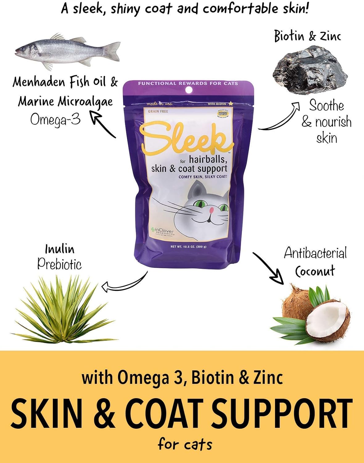 Sleek is scientifically formulated to restore the optimal coat luster and manage shedding in your cat! Sleek provides key Omega 3 fatty acids from fish oil and marine micro for healthy skin and a lustrous coat. Biotin and Zinc are key nutrients for radiant and healthy hair, so of course, we put them in Sleek! Sleek is designed to naturally enhance the luxurious feel of your cat’s coat, while aiding in the control of hairballs. Give Sleek daily so your cat can be as sleek as he can be!