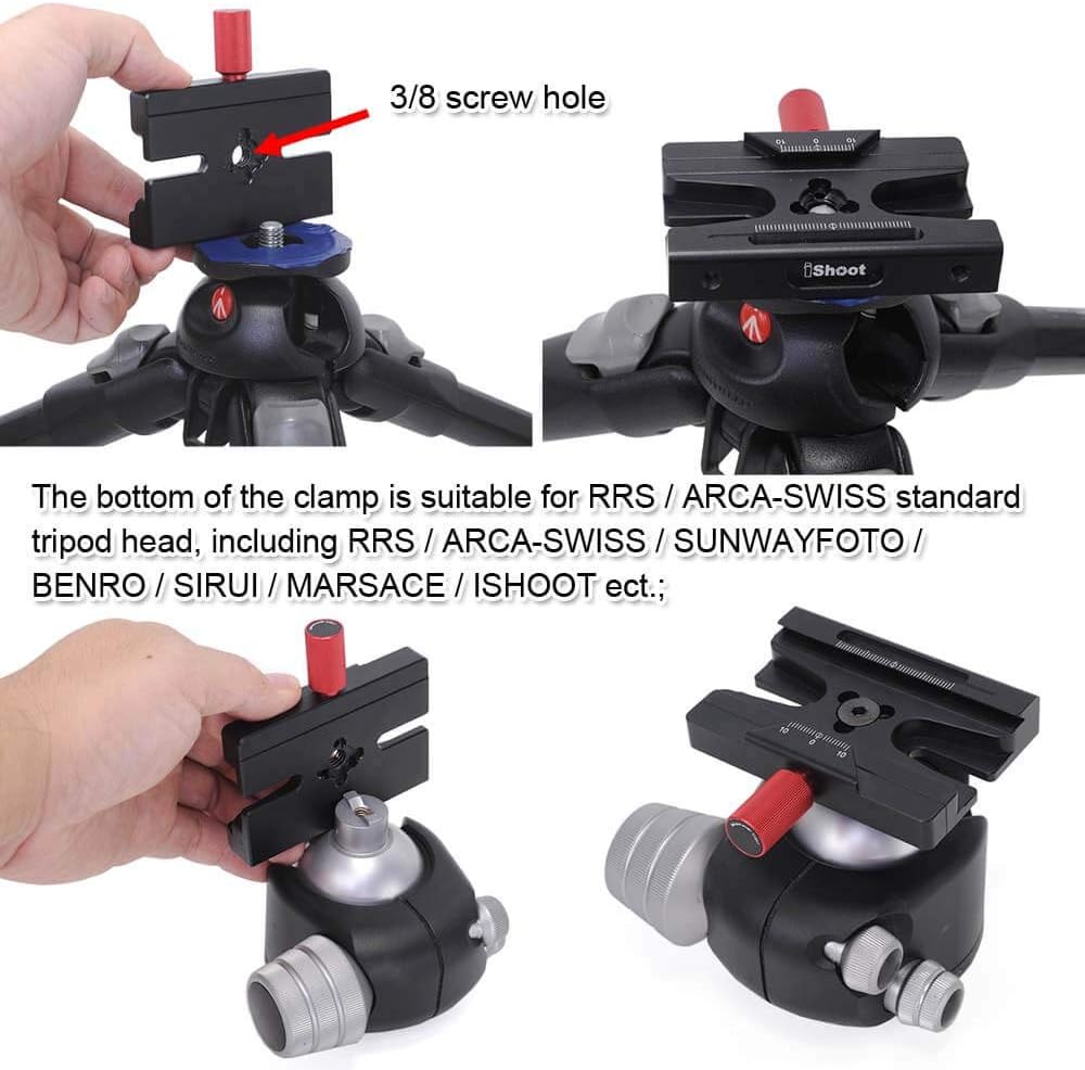 iShoot Multifunctional Quick Release Plate Clamp IS-JZ85MFT Main features: 1. New design, the clamp is compatible with Arca-Swiss fit quick release plate and Manfrotto 200PL / 410PL plate; also compatible with Manfrotto / Gitzo quick release plate of ARCA-SWISS fit; 2. The bottom of the clamp is suitable for RRS / ARCA-SWISS fit tripod head, including RRS / ARCA-SWISS / SUNWAYFOTO / BENRO / SIRUI / MARSACE / ISHOOT ect.; 3. The bottom of the clamp can be used to Gitzo GH1780 / GH2780 / GH3780 series Tripod Head; no practical tests have been conducted on other Gitzo tripod heads; 4. Through the attached converter, the bottom of the clamp can be used to Manfrotto tripod ball head of MH490 / 492 / 494 / 496 / 498 series, MH054 / 055 / 057 series, MHXPRO series ect. Compatible with Quick Release plate: 1. Arca-Swiss fit of quick release plate of RRS / ARCA-SWISS / SUNWAYFOTO / BENRO / SIRUI / MARSACE / ISHOOT; 2. Manfrotto / Gitzo quick release plate of ARCA-SWISS fit 3. Manfrotto 200PL / 410PL quick release plate; Tripod Head: 1. ARCA fit tripod head of RRS / ARCA-SWISS / SUNWAYFOTO / BENRO / SIRUI / MARSACE / ISHOOT, 2. Gitzo GH1780 / GH2780 / GH3780 series tripod head; 3. Through converter, the bottom of the clamp can be used for Manfrotto tripod ball head of MH490 / 492 / 494 / 496 / 498 series, MH054 / 055 / 057 series, MHXPRO series ect. Package Includes: 1 x iShoot Multifunctional Quick Release Plate Clamp IS-JZ85MFT (The other items in the photos not listed here are for illustrating only, not included)