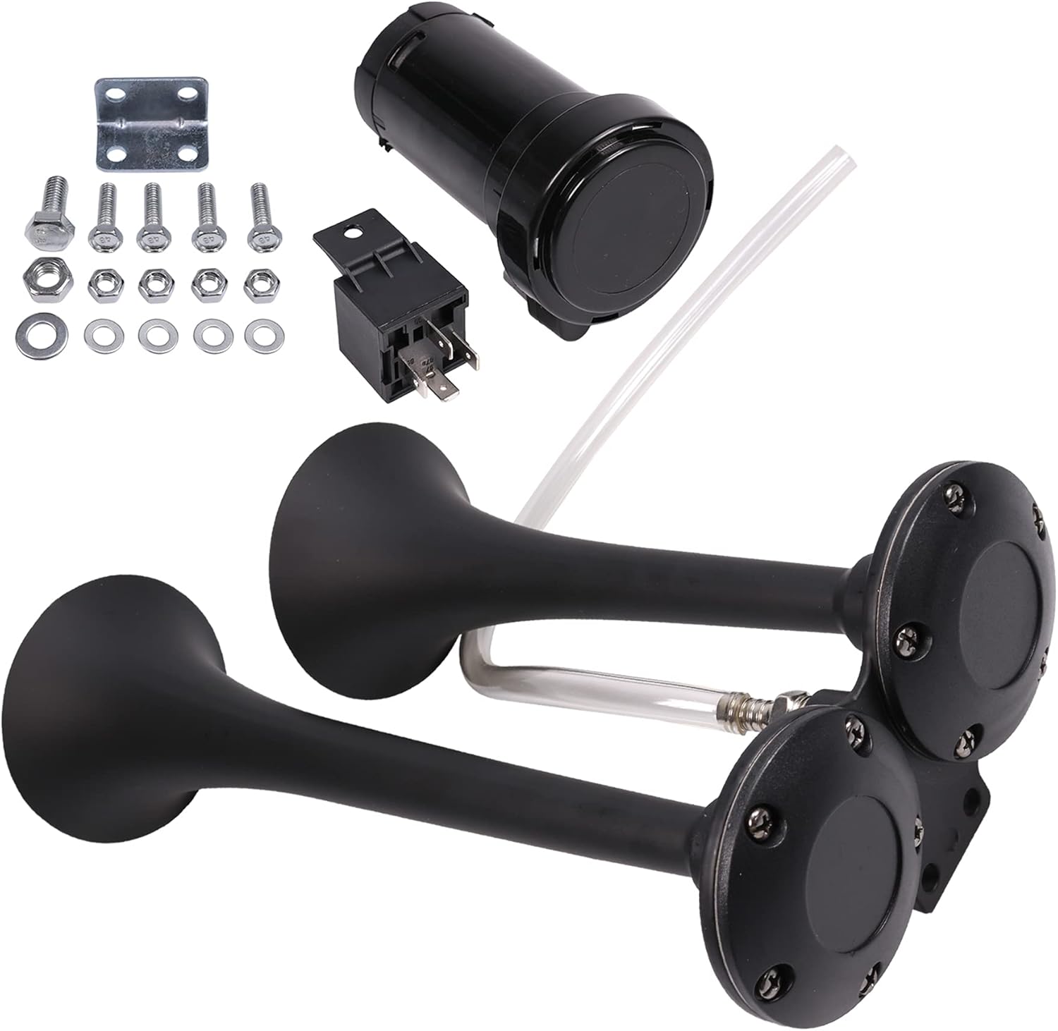 Black Color, Metal Construction, 12V Heavy Duty Air Compressor, 4-PIN 12V/30A Relay, 3/8" OD Air Hose, Mounting Hardware Included This black color, dual trumpet horn, will produce a strong power driven sound. The trumpets are made of metal to ensure better sound quality, maximum strength and durability. The system includes one maintenance free heavy duty 12 volt air compressor, hose, relay and mounting hardware. The perfect compact solution to enjoy a loud horn sound on all vehicles with a 12V system. Features Dual Trumpet Train Air Horn Kit (Black) Metal Construction 12V Heavy Duty Air Compressor Can be mounted on roof, or under the hood Horn Size: 11-½", 9", 3-½" Diameter each Included in this kit: Dual Trumpet Air Horn 12V Heavy Duty Air Compressor 4-PIN 12V/30A Relay 3/8" OD Air Hose Mounting Hardware Installation Instructions Specifications Type Full System Trumpet/Horn Trumpets Total 2 Sound Type Train Power 12 Volts Construction Metal Mounting Hardware Mounting Hardware, Hose and Relay Dimensions (L x D) 11-½", 9", 3-½" diameter each Overall Dimensions (L x W x H) 11-3/8" x 6-½" x 3-½" Compressor Power 12 Volts Maximum Pressure 18 PSI
