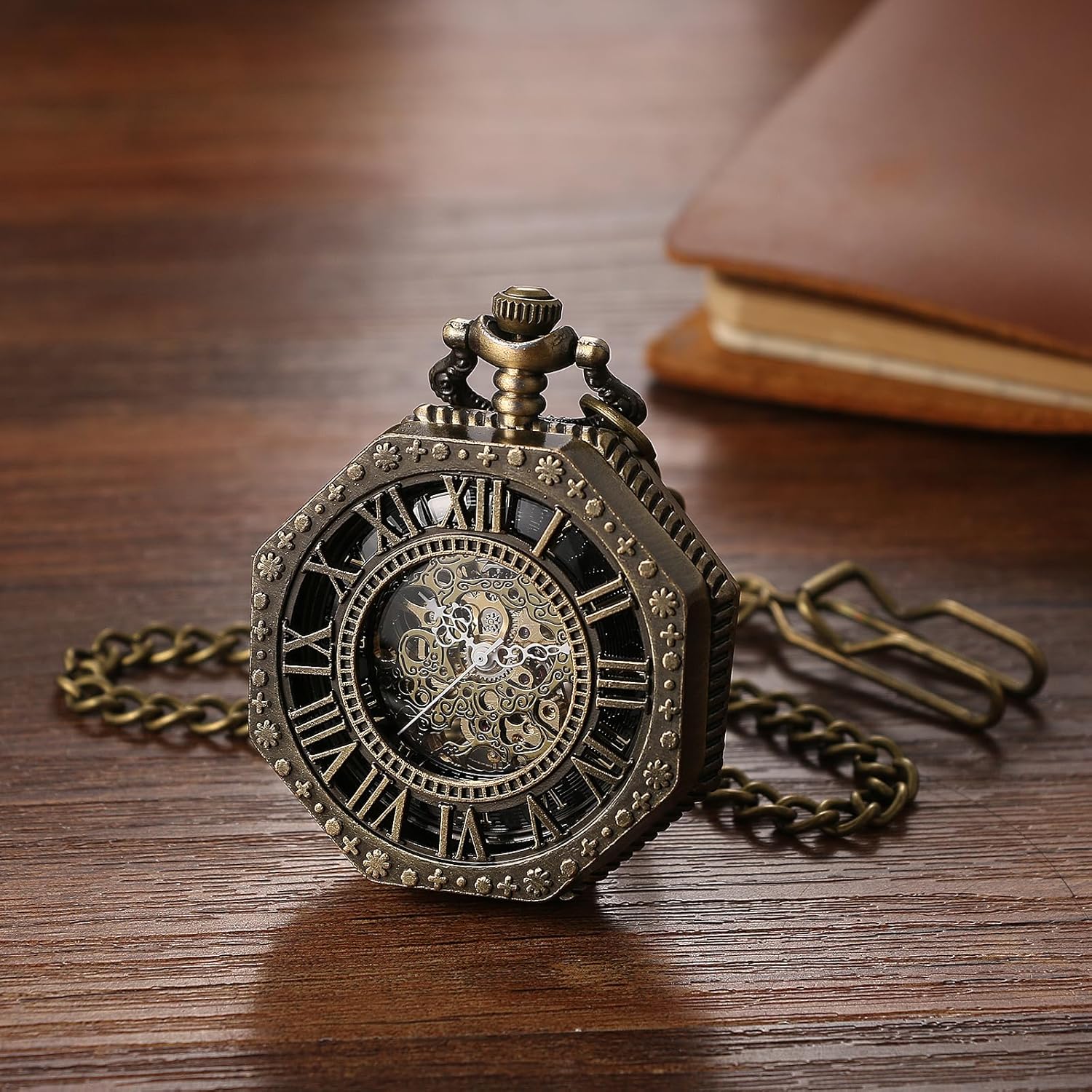 JewelryWe Octagonal Mechanical Pocket Watch with Roman Numerals: Step back in time with our exquisite skeleton pocket watch, featuring a unique octagonal design that showcases meticulous craftsmanship and vintage elegance.Product Specifications:Dimensions: 1.85" (4.7cm) octagonal case, 0.51" (1.3cm) thicknessChain Length: 14.96" (38cm) for convenient waist attachmentWeight: 2.86oz (0.08kg) for black finish, 2.5oz (0.07kg) for antique bronzeMaterial: Premium metal alloy with stainless steel back coverAvailable Colors: Black or Antique BronzePackage Includes:1 x JewelryWe Watch1 x Gift BagFeatures:Captivating Skeleton Design: See-through dial reveals intricate mechanical movementsManual Wind Mechanism: Classic winding crown provides approximately 12 hours of accurate timekeepingOrnate Roman Numerals: Bold numerals and elegant hands against skeleton backgroundDecorative Chain: Sturdy linked chain with secure clip for attaching to pockets or belt loopsThis handcrafted timepiece combines old-world charm with practical functionality. The exposed gears and mechanical movement create a fascinating visual display, while the octagonal case adds distinctive character. Perfect for special occasions, gifts, daily use, or as a sophisticated accessory for formal events.Note: As a manual mechanical watch, winding is required approximately every 12 hours to maintain accurate timekeeping.