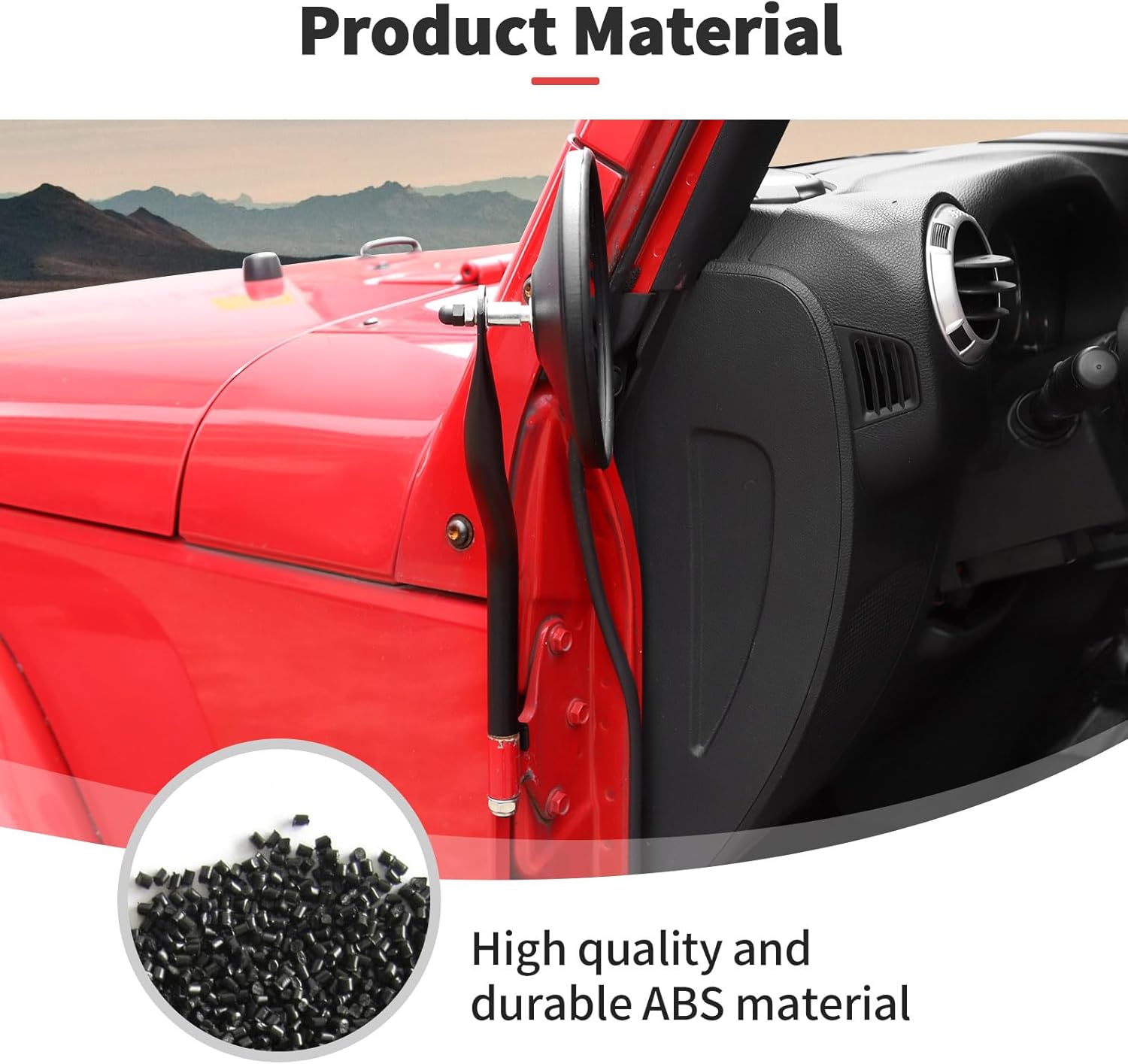 Model: -Door off Mirrors Side View Mirrors A-pillar Hinged Rearview Mirror for 1997-2024 Jeep Wrangler JL/JLU JK JKU JT TJ YJ Feature: -Material: Made of Excellent Quality ABS plastic.This kind of material is strong and wear-resistant, and the adhesive can make the accessories fixed on the instrument very well. -Provides a Excellent class, unique and fashion decor style to enhance the visual appearance of your car. It can cover existing scratches and prevent your door Door Handle from fingernails, key scratches and etc. Dress up your Door Handle and makes your car out of ordinary.Installtion Notes -1.Clean all positions with rubbing alcohol where will be covered in the shifter plate. (Very important); -2.Make sure you heat both the accessories and the tape on the cover piece; -3.After the alcohol is dry, remove the protective film from the Double- sided tape on the back of the product; -4. Paste the accessories in the corresponding position and press it with your hand to make it more solid.After sales service -Our all products have 30 days of after-sale protection and 2 years services -If you have any suggestions or questions for our products, please Get in Touch with Us as soon as possible.Package Include:2*Rearview Mirror