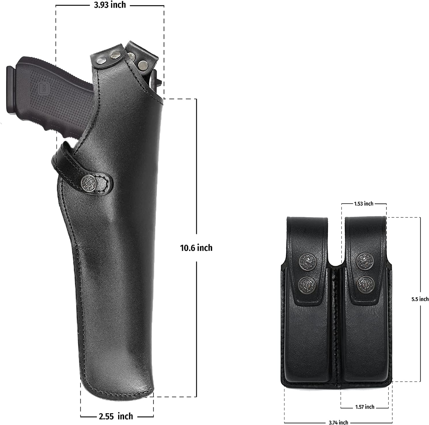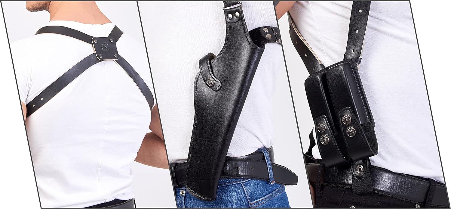 Carry with confidence and class using this premium handmade leather shoulder holster rig with dual speedloader pouch. Whether you're on duty, at the range, or simply prefer the balance and convenience of shoulder carry, this rig delivers timeless style with dependable performance. Built from durable, high-grade leather and finished in sleek black, this right-hand shoulder holster is molded for a precise fit that retains your revolver securely while allowing for smooth, natural draws. The open-bottom design accommodates various barrel lengths, while the reinforced thumb break provides an extra layer of safety and control. Fully adjustable leather harness straps ensure a tailored fit across the shoulders and back, distributing weight evenly for extended wear without discomfort. The rig includes a double speedloader pouch on the opposite side for balanced carry, letting you reload quickly without fumbling — a must-have for both tactical professionals and revolver enthusiasts. Snap closures on the pouch keep your speedloaders locked in place during movement, while the robust stitching and riveted stress points ensure long-term durability even under active conditions. Whether you’re a law enforcement officer, outdoorsman, or collector, this shoulder system is built to perform when it matters most. Designed for revolver owners who demand functionality, craftsmanship, and comfort, this leather shoulder holster is more than just gear — it’s a serious tool for serious carriers.