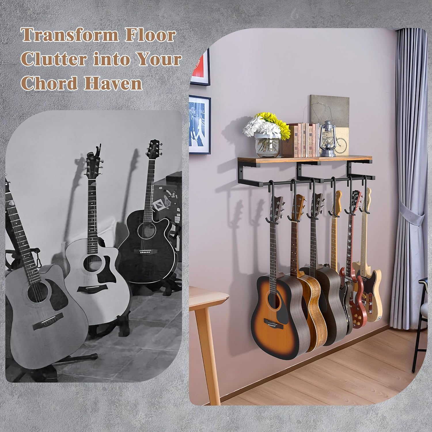 Keebofly Heavy Duty guitar wall mount hanger System: 6-Detachable Hook Rack with Rustic Shelf Universal Guitar Wall Hanger & Holder Featuring 6 detachable S-hooks that fit all headstocks - from slim ukuleles to wide bass guitars. These guitar wall hooks instantly convert to portable hangers for doors, closets, or retail rails. Adjust spacing freely for custom layouts! Securely holds acoustic, electric, bass guitars via patented curve design.Ideal for ukulele wall mount,electric guitar wall mount Industrial Guitar Wall Rack & Stand Built with 2-inch thickened wood shelf and steel-core hooks holding 30kg (66 lbs) 300% stronger than standard guitar wall mounts - perfect for hanging guitar stands in studios or stores. Supports heavy bass guitars without wobbling on wall mounted guitar holder systems. Scratch-Proof Guitar Wall Hook Rubberized coating prevents finish damage on all guitars (tested Gibson/Fender). The guitar wall hook's rubber surface stops slippage even when bumped. Guitar mount keeps instruments 9" from walls - no scuff marks! Ideal for delicate acoustic guitar wall mount or ukulele wall mount hanger. Multi-Functional Guitar Holder Wall Mount for Display & Storage Create stunning guitar gallery walls or compact guitar corners: Horizontal guitar wall mounts for 6-guitar displays Lowered guitar stand wall mount positions for amp/headphone shelf storage Rustic wood shelf (9" deep) holds amps, effect pedals, plants, or merch Saves floor space in dorm rooms or stores! Pro Installation & Guarantee Guitar Hooks for Wall Screw-mounted guitar holder includes corrosion-proof hardware + visual guide - superior to guitar mount no drill adhesives. Ships in damage-proof packaging for guitar wall mount horizontal/vertical setups!