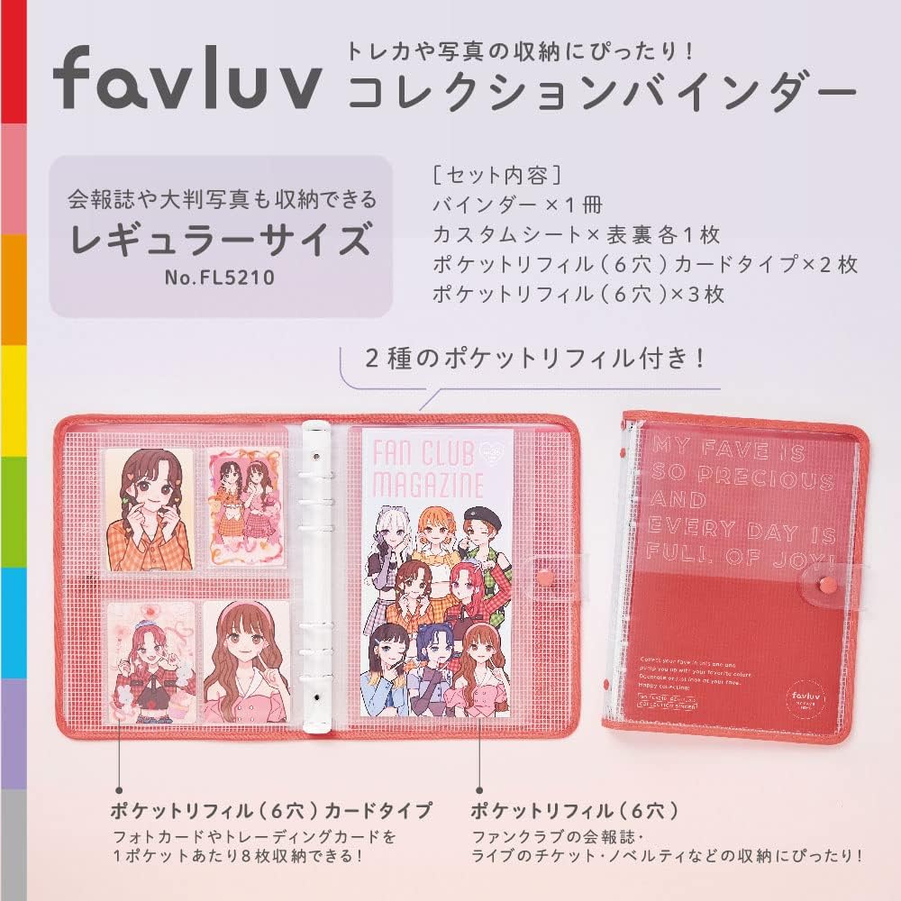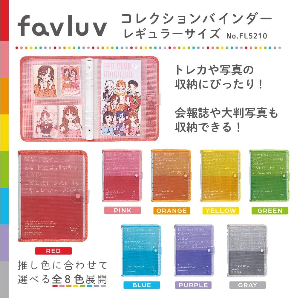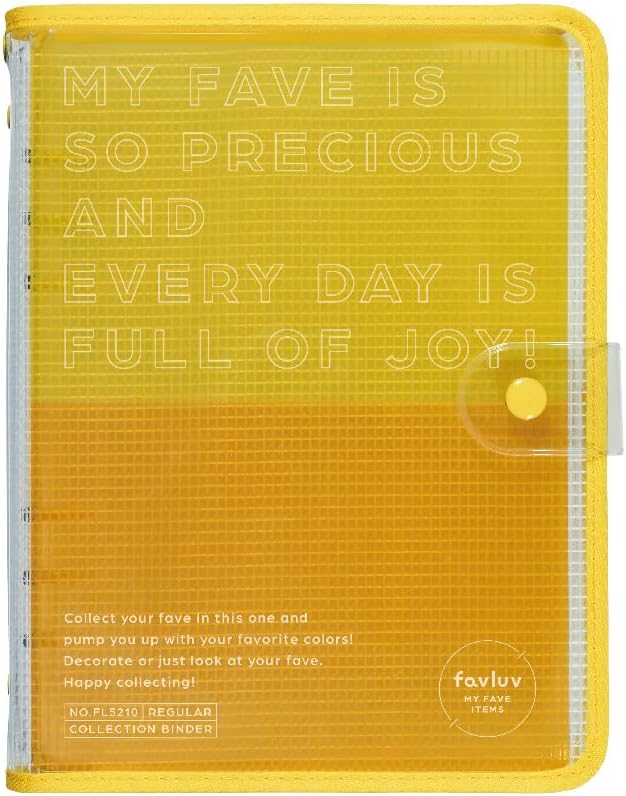 The "favluv Series" is a series that can be enjoyed from storage to decorating items that can be enjoyed with the concept of "make the deduction more colorful everyday". Available in 8 colors that you can choose from the guessing colors. ■ Regular size that can also store registration magazines and large photos. This large capacity 6-ring binder allows you to neatly collect many of your favorites. Includes 2 pocket refills for smaller photos and card sizes, and 3 pocket refills to store registration books, tickets, etc. You can also set additional refills (sold separately), so you can customize them to fit your personal needs. ■ Transparent cover to customize your own personal preference. Transparent front cover allows you to put your favorite photo inside the cover. Custom bi-fold sheets on front and back cover. Protect your favorite photos on custom sheets or attach them to your own personal decorations. ■ Includes a charm hole to attach your favorite charm Charm hole on spine You can attach your favorite charms or keychains. You can carry it with your trekas or photos by attaching your decorative acrylic keychain or live gear Take it with you anytime. Specs and Notes Collection Binder, Regular Size. ■ External dimensions: Approx. 6.9 x 9.3 x 1.2 inches (175 x 237 x 30 mm). ■Weight: 8.5 oz (241 g). ■ Set Includes: Binder x 1, Custom Sheet x 1, Pocket Refill (6 Holes) Card Type x 2, Pocket Refill (6 Holes) x 3 ■ Maximum storage capacity: Pocket refills (6 holes) are approximately 30 pieces, Pocket refills (6 holes) approximately 20 cards. ■Material: PVC (binder), PP (pocket refill), PET (custom sheet), Steel (binding tool) Precautions for Use: When inserting prints and photos on the cover, be sure to place them in the custom sheet. Please dry it well before drying. Leaving the cover or pocket or print close for a long time may cause printing to transfer. We are not responsible for any damage or damage of items stored in this product. Please acknowledge Please note that too much storage may damage the product. Maximum pocket storage capacity is approximate. Front and back depending on the storage items. Due to the nature of the material, there may be some adhesion or color transfer to the vinyl material. Do not wash with water and dry with soft cloth. Do not use thinner, detergent, alcohol, etc. Do not use or store in direct sunlight, high temperature or high humidity. Product specifications, price, design, etc. may change without prior notice due to product reviews. Product Name: King Jim FL5210 Ole Collection Binder, Regular Size, Orange