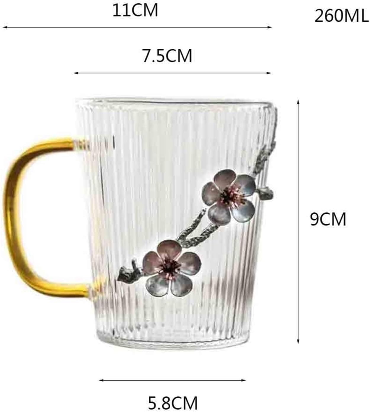 Perfect for any occasion, from casual dinners to festive parties, providing a stylish and practical choice for your beverage needs.8.8Oz Clear Borosilicate Glass Coffee Mug with Handle, Vertical Striped Drinking Glass with Tin Plum Blossom DecorationProduct Name: Vertical Striped Borosilicate Glass Coffee Mug with Handle Material: Borosilicate GlassColor: ClearSize: 7.5×5.8×9cmCapacity: 260mlPack List: 1 PackNote:1. Please check the size and color before purchasing.2. Does not include items other than those shown in the product photo.3. Please note that due to the different monitors, slight chromatic aberration may occur, please understand.4. The above data is for reference only, the size is manual measurement, each variable may be different, please refer to the actual product, thank you.