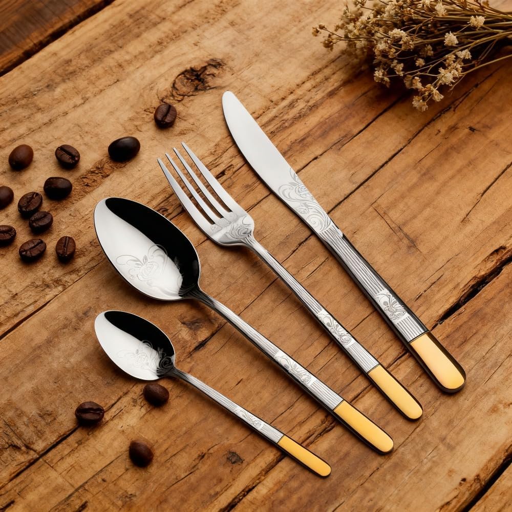 Package Quantity: (4-piece set) includes: 1 each of table knife, fork, spoon, and dessert spoon.(16-piece set) includes: 4 each of table knife, fork, spoon, and dessert spoon. Material: 201 stainless steel Finish: Mirror polish Style: Modern and minimalist